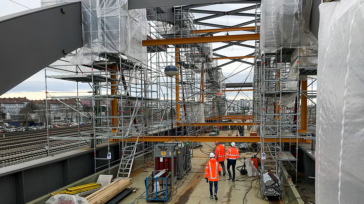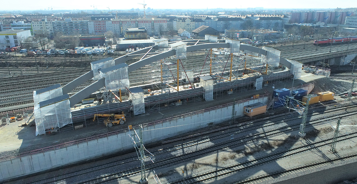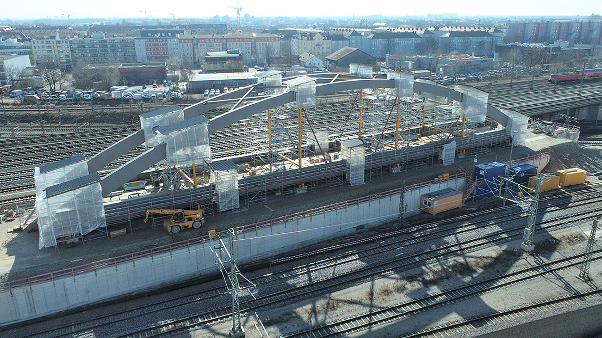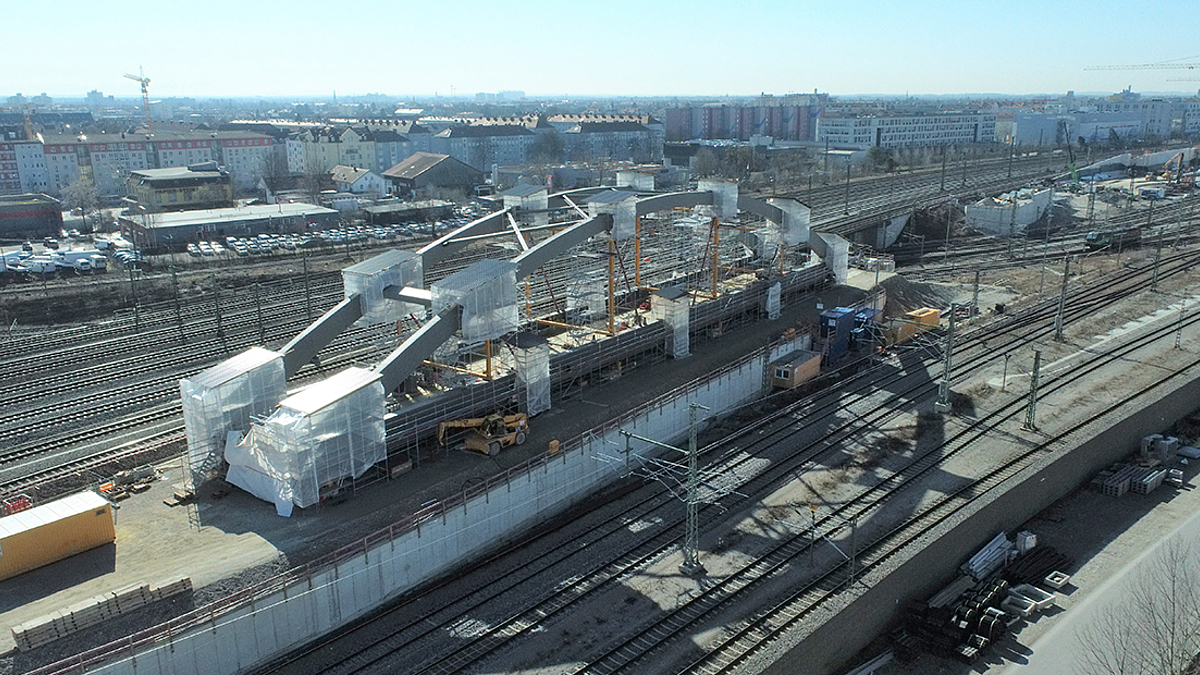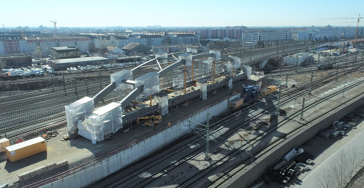 Bereits im März fand die schweißtechnische Abnahme zur Montage des Stahlüberbaus der Stabbogenbrücke „Objekt V“ statt. Die Eisenbahnüberführung gehört zu dem neuen Kreuzungsbauwerk, das im Zuge der Herstellung der 2. S-Bahn-Stammstrecke bei Bau-km 102,1-92 errichtet wird. Das Brückenbauwerk überführt die 2. S-Bahn-Stammstrecke (Strecke 5547 bei km 0,7+22) nördlich des Bestandskreuzungsbauwerk. Der Überbau wird als zweigleisige Stabbogenbrücke in Stahlbauweise mit längsorientierter Fahrbahn (Langerbalkensystem) hergestellt. Die Gleise werden mit Schotteroberbau überführt. Die Stützweite der Stabbogenbrücke beträgt 92,0 m.