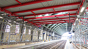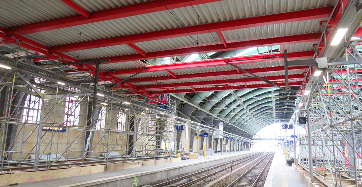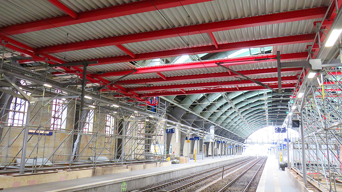 Seit Anfang des Monats wird für die Dachsanierung eine bauzeitliche Arbeits- und Schutzplattform in der Südhalle, im Bereich der Gleise 1 und 2, errichtet. Diese Plattform überspannt ca. 1/3 der gesamten Hallenlänge und ermöglicht, dass die Arbeiten unter laufendem Betrieb ausgeführt werden können. Julian Schöne, der seit Anfang 2020 als Projektingenieur für KLÄHNE BUNG tätig ist, ist von diesem Projekt begeistert: „Es ist für mich hochspannend an einem Projekt mit so hoher Dynamik mitzuwirken, bei dem die Planung direkt „vor der Tür“ umgesetzt wird."