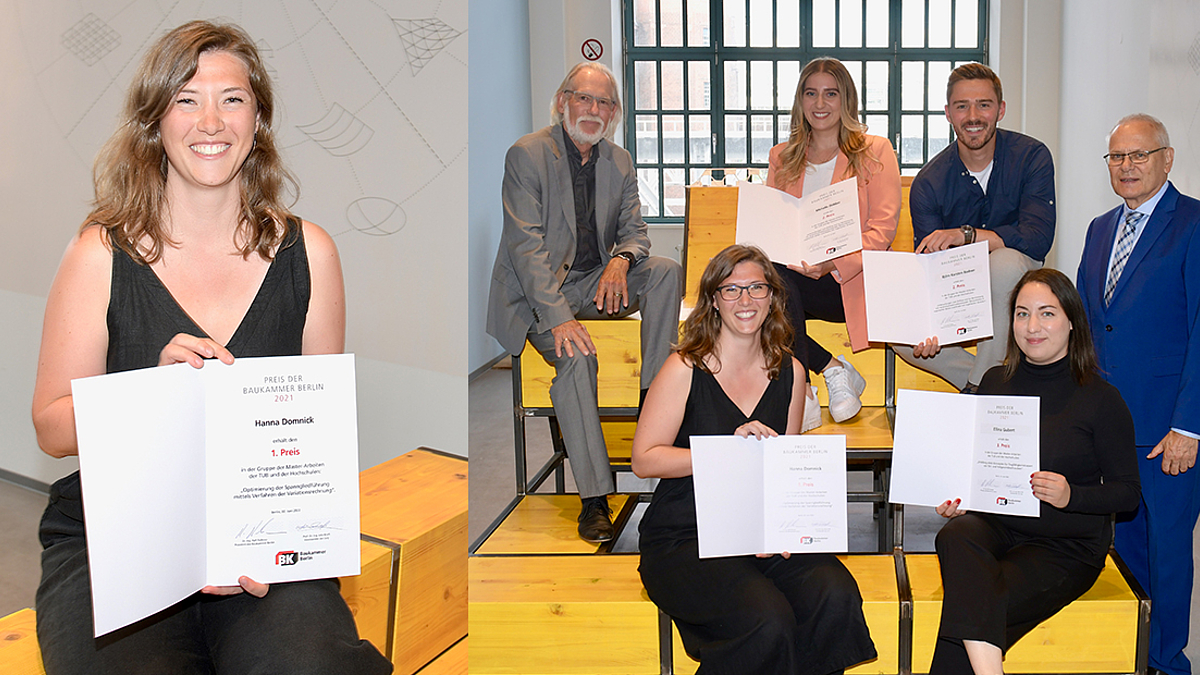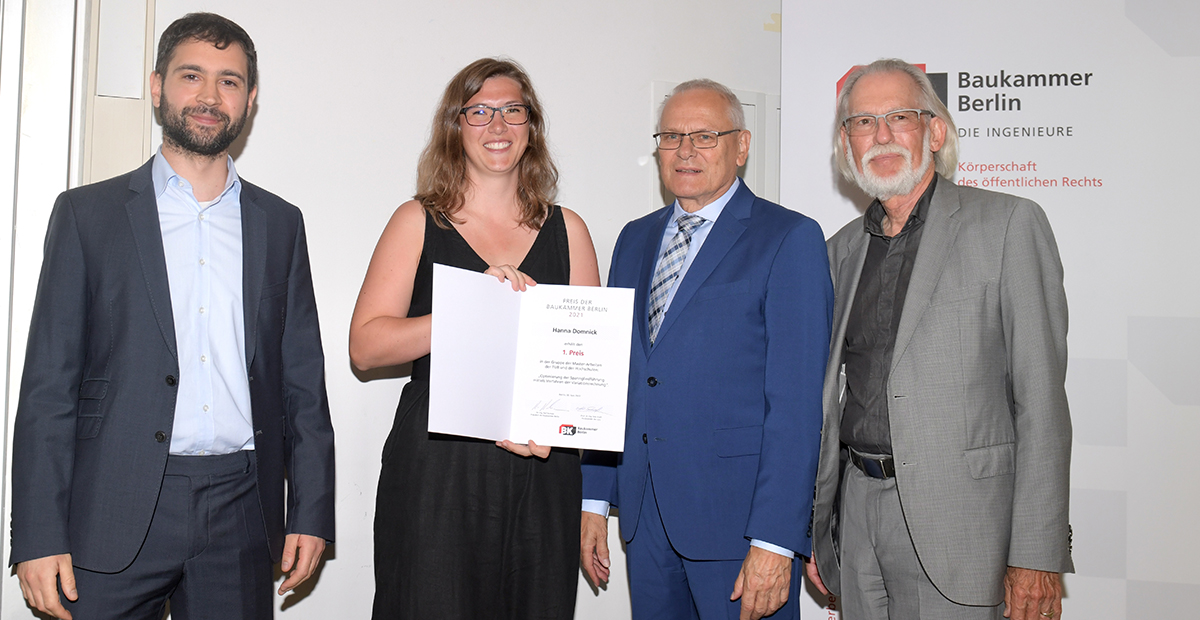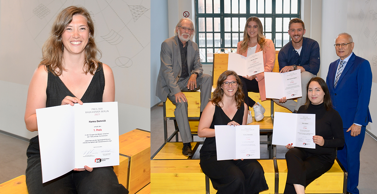 Am 02. Juni 2022 wurden die Baukammerpreise der Baukammer Berlin für herausragende Studienabschlussarbeiten der Bereiche Bauingenieur- und Vermessungswesen verliehen. Wir freuen uns, dass unter den PreisträgerInnen auch Hanna Domnick ist, die zunächst als studentische Mitarbeiterin und seit Ende letzten Jahres als Projektingenieurin Mitglied unseres Teams ist. Hanna erhielt für ihre an der TU Berlin verfassten Masterarbeit zur Optimierung der Spanngliedführung mittels Verfahren der Variationsrechnung den 1. Preis. Wir gratulieren und freuen uns, dass sie ihre berufliche Karriere bei uns begonnen hat.