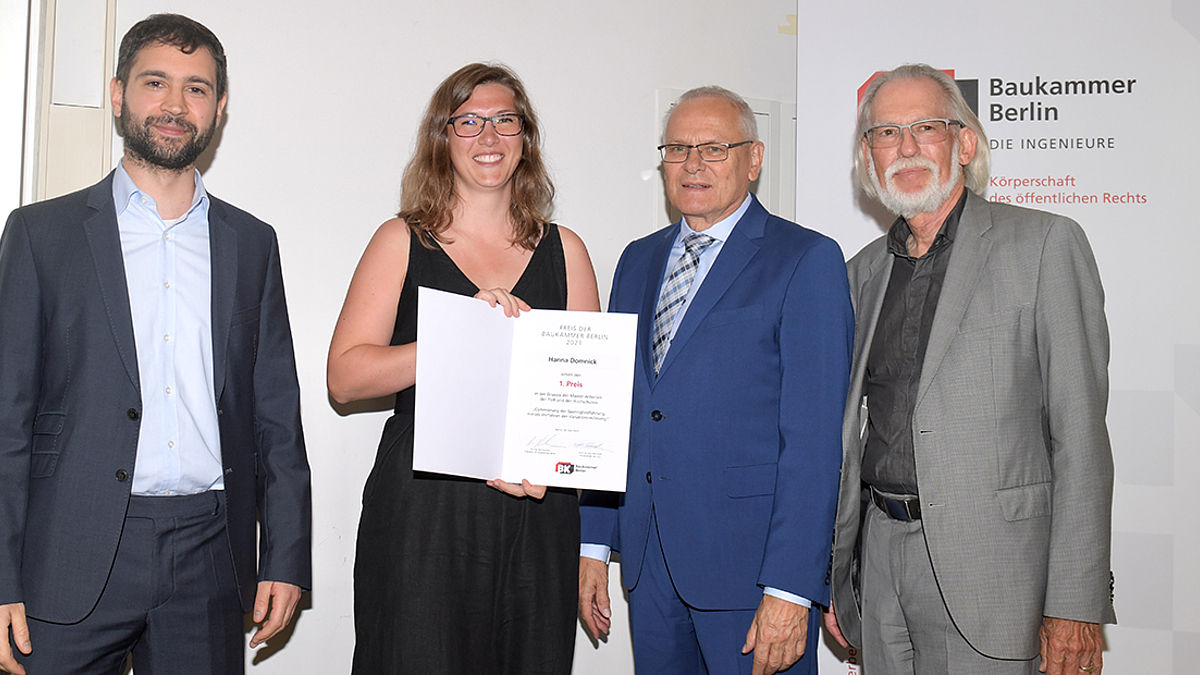 Auf dem Bild oben sieht man sie zusammen mit ihrem Betreuer Juan Pablo Osman Letelier, dem Vorsitzenden der Jury Prof. Dr.-Ing. Udo Kraft und dem Präsidenten der Berliner Baukammer Dr.-Ing. Ralf Ruhnau (v.l.n.r.).