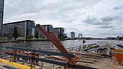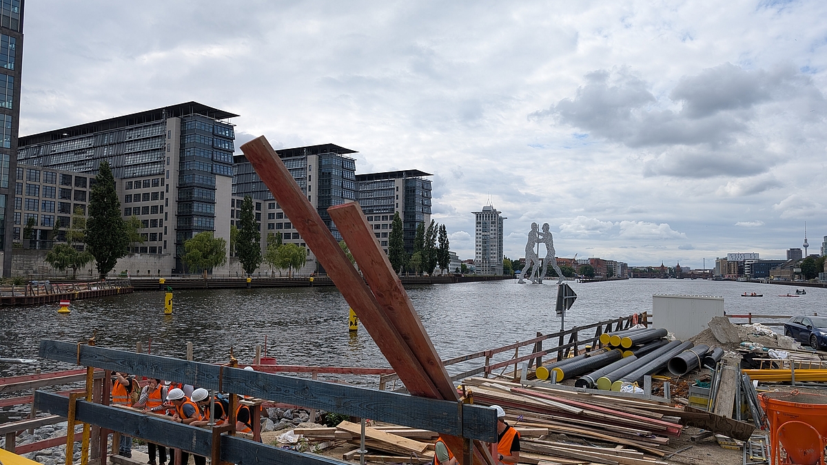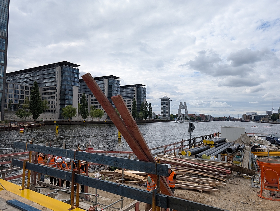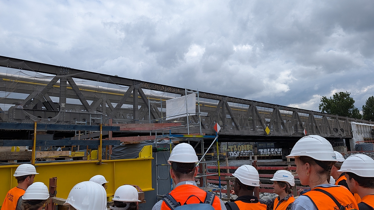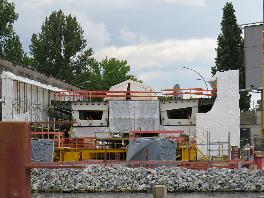 Der Baufortschritt war bei unserer Besichtigung im Juli eindrucksvoll sichtbar: Der Überbau wird auf beiden Seiten der Spree montiert. Die einzelnen Schüsse werden auf den Verschubbahnen in den Vorlandbereichen vormontiert und anschließend in Richtung Spree verschoben.