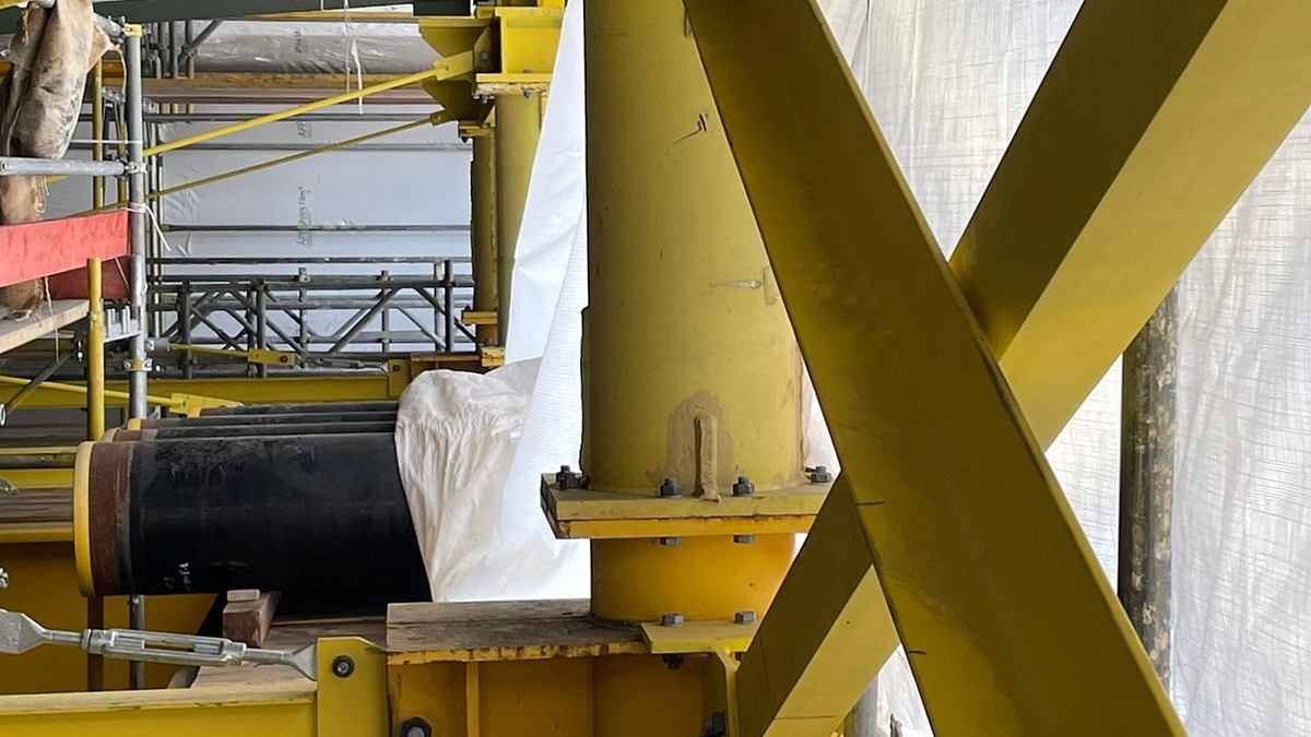 Besonders beeindruckend war der bereits vollständig verschweißte Mittelteil des Überbaus – bestehend aus drei Schüssen mit einer Gesamtlänge von 41 m und einem Gewicht von ca. 450 t. Dieser Abschnitt war zum Zeitpunkt der Besichtigung bereits eingezellt und für die Korrosionsschutzarbeiten vorbereitet.