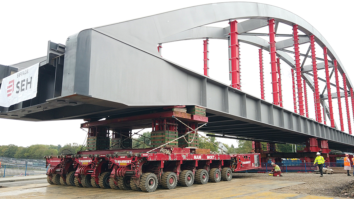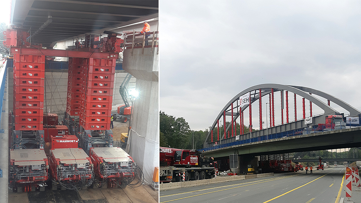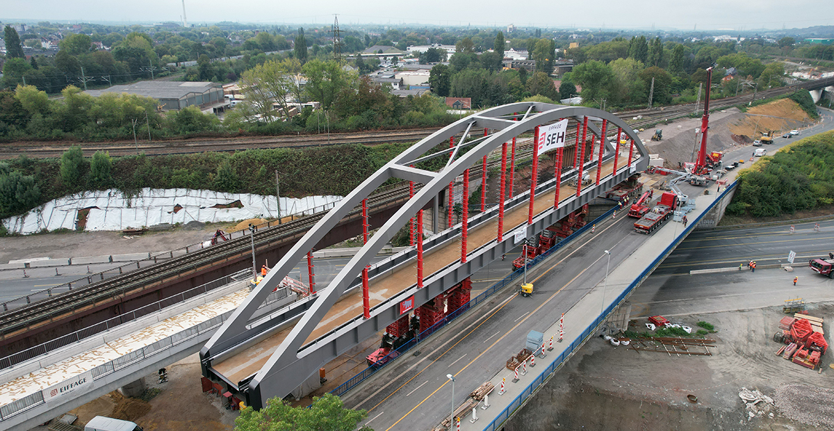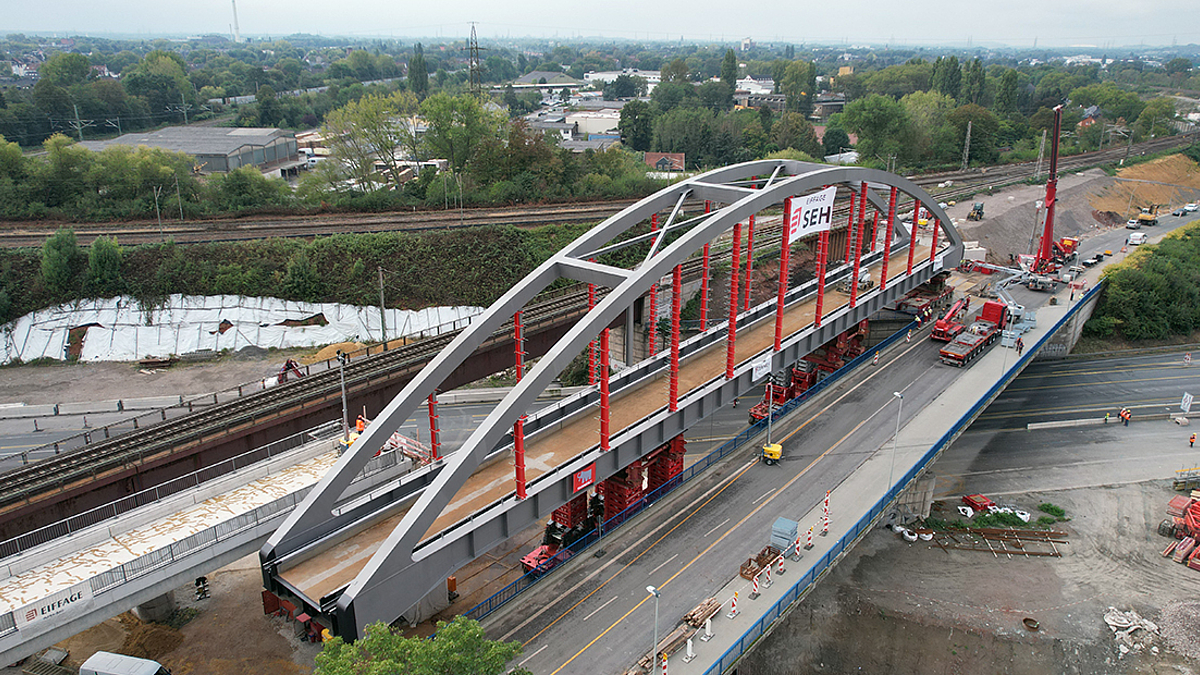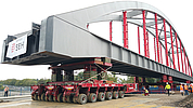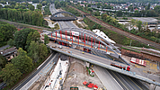 Die Montage des Stahlüberbaus der 97,50 m langen Stabbogenbrücke begann bereits im Juli. Ende September wurde der 950 t schwere Überbau dann mittels SPMT-Einheiten längs und quer in die Endposition verschoben. Dank der guten Zusammenarbeit aller Beteiligten konnte das Bauwerk lange vor Ende der genehmigten Sperrpause an die Endposition verfahren werden.