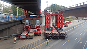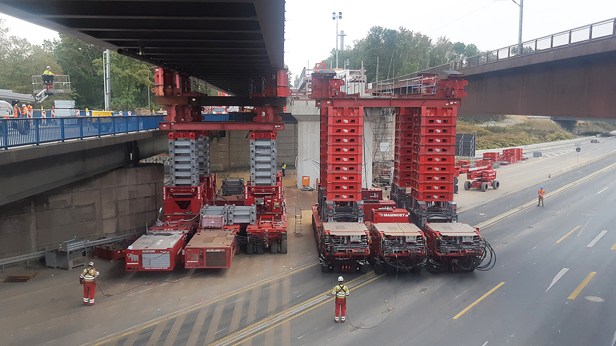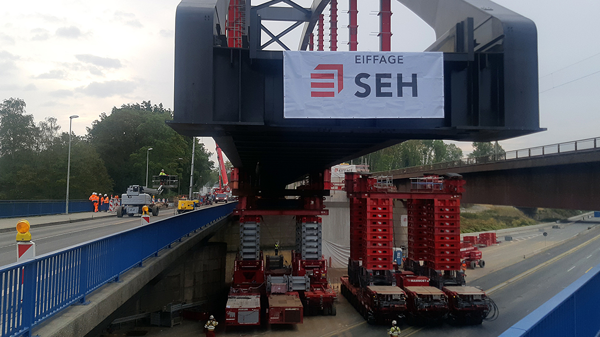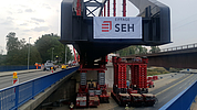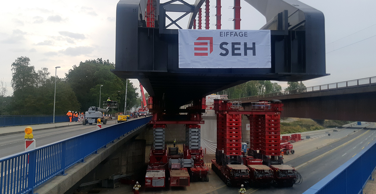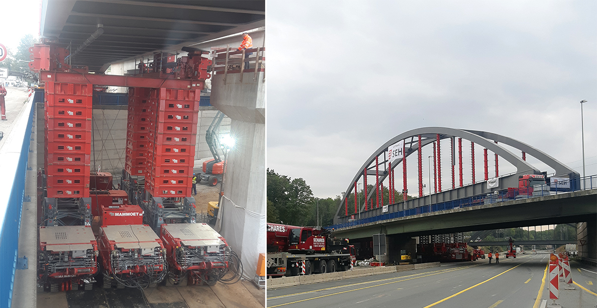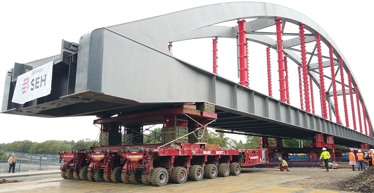 Die Montage des Stahlüberbaus der 97,50 m langen Stabbogenbrücke begann bereits im Juli. Ende September wurde der 950 t schwere Überbau dann mittels SPMT-Einheiten längs und quer in die Endposition verschoben. Dank der guten Zusammenarbeit aller Beteiligten konnte das Bauwerk lange vor Ende der genehmigten Sperrpause an die Endposition verfahren werden.