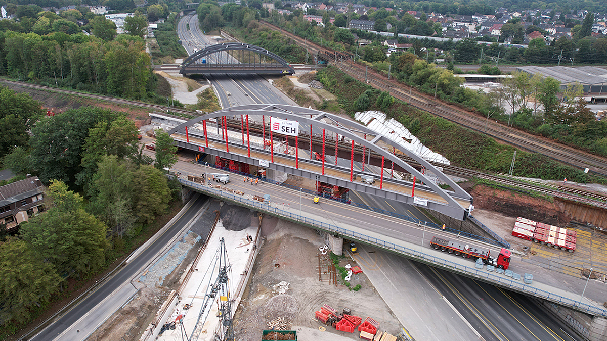 Die neue Eisenbahnüberführung wird die elektrifizierte Strecke 2221 in einem eingleisigen Streckenabschnitt über die A 43 führen. Der Überbau besteht zum einem aus dem Stabbogenüberbau und zum anderen aus einem WiB-Überbau (SiB) (Stützweite 32,40 m). Gerade der Umgang mit der Längskraftabtragung war eine besondere Herausforderung in diesem Projekt, da das Brückenbauwerk mit dem Stabbogen- und dem WIB-Überbau eine Trägerkette darstellt, deren Enden jeweils ein stärker dimensioniertes, tiefgeründetes Widerlager und in der Mitte einen Auflagerpfeiler hat. Sowohl die beiden Überbauten als auch die Unterbauten wirken bei der Längskraftabtragung von der Schiene auf die Tragwerke zusammen, was sich erheblich auf die Schienenspannungsberechnungen auswirkt. Dank des Einsatzes der 3D-Planung konnten bereits frühzeitig Kollisionspunkte erkannt und Lösungswege entwickelt werden.
