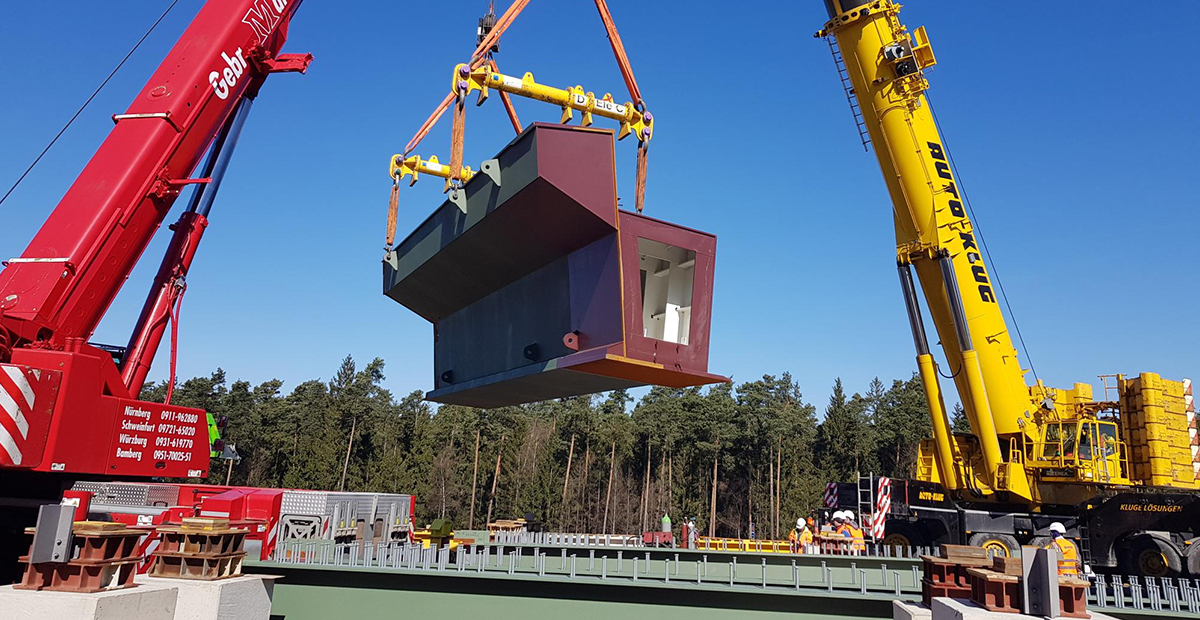 Der gesamte Überbau wurde für die Montage entsprechend der Transportmöglichkeiten und der Hubkapazitäten der benötigten Mobilkrane in 49 Schüsse eingeteilt, wobei ein Schuss ca. 12 m lang ist. Ein Takt zum Einschieben besteht aus 5 bis 10 Schüssen mit einer Gesamtlänge von ca. 100 m. Der Überbau wird in 6 Takten eingeschoben werden.
