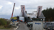 Bei der Überbauherstellung im Taktschiebeverfahren treten Zustände mit freien Kragarmlängen von bis zu 115 m auf. Um in diesen Zuständen die Kragmomente und die damit verbundenen Verformungen der Kragarmspitze zu begrenzen, wird der Überbau mit einem Vorbauschnabel mit einer Länge von 50 m und einem Gesamtgewicht von ca. 140 t versehen.