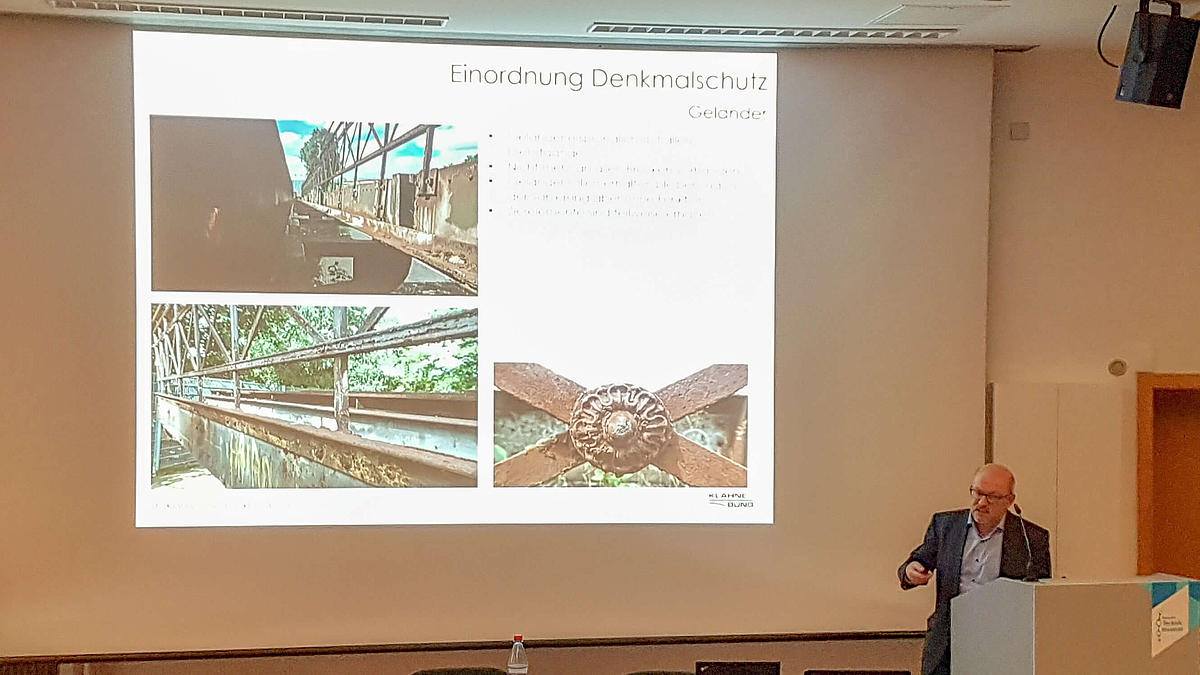 Nach einer Einordnung der Brücken in den historischen Kontext durch Prof. Dr.-Ing. Werner Lorenz stellte Dr. Klähne das Bauprojekt vor, dabei ging er insbesondere auf die konstruktiven und gestalterischen Änderungen der Bauwerke im Zusammenhang mit der Umnutzung ein. Die Ertüchtigung der genieteten Stahlkonstruktionen durch die Anwendung der Niettechnik und durch Änderung und Reparatur stahlbaulicher Details, der Neuaufbau der Fahrbahn und die Ausstattungen standen hierbei im Vordergrund.