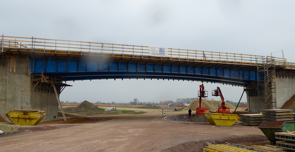 Im September wurde nach einer Bauzeit von gut vier Jahren die Ortsumfahrung Wedringen im Zuge der B71 für den Verkehr freigegeben. Zu der neuen, zwischen der BAB A 14 und Haldensleben gelegenen Trasse gehört auch das BW 5, für das wir die Ausführungsplanung im Auftrag der OST BAU GmbH erstellt haben.
