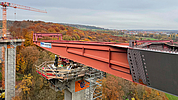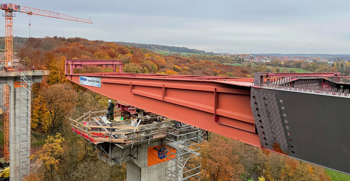 Und noch ein Großprojekt schreitet voran: Bereits im Juni begann der Längsverschub des ersten Teilbauwerks der Talbrücke Thulba, die als siebenfeldrige Stahlverbundbrücke die A7 über das Thulba-Tal überführt. Anfang November wurde dann das mit 90 m längste Hauptfeld des ersten Überbaus im Taktschieben überquert. Für die Prüfung der Ausführungsplanung der Überbauten bin ich verantwortlich, die Prüfung der Unterbauten erfolgt durch Prof. Dr.-Ing. Manfred Keuser.
