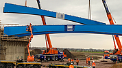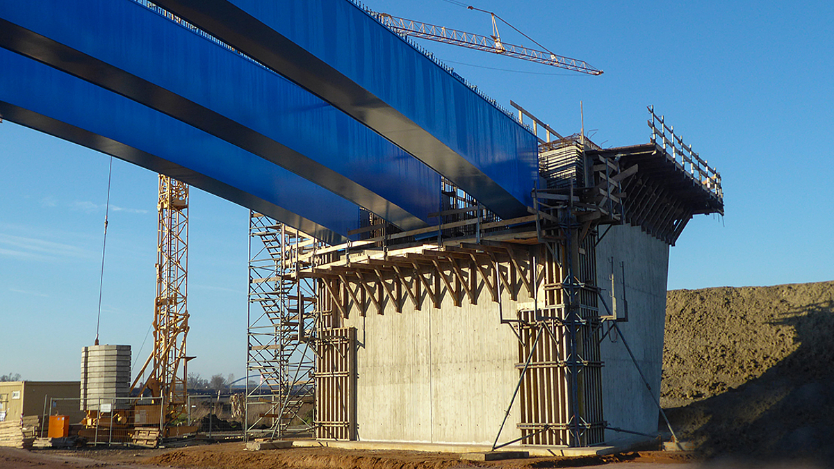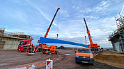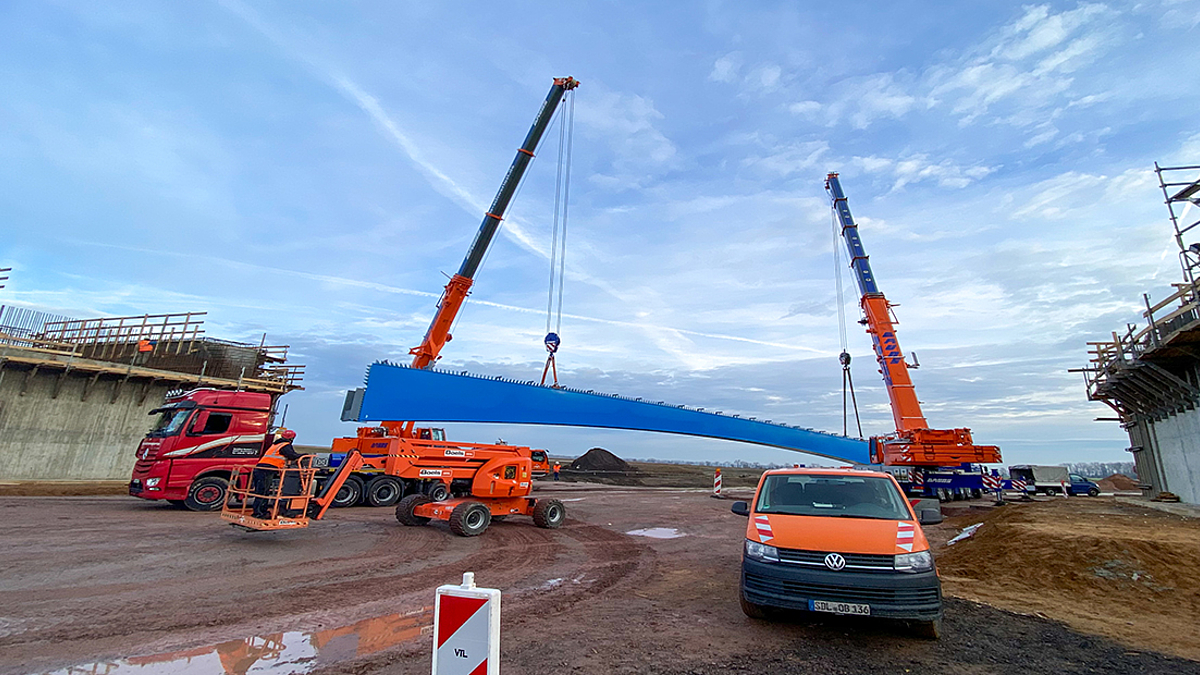 Kurz vor Weihnachten 2020 erfolgte der Einhub der drei stählernen Hauptträger per Kran. Der finale Überbau besteht aus einer Stahlverbundkonstruktion aus drei gevouteten, nicht begehbaren Stahlhohlkästen, die im Grundriss gekrümmt sind, im Verbund mit einer Stahlbeton-Fahrbahnplatte.