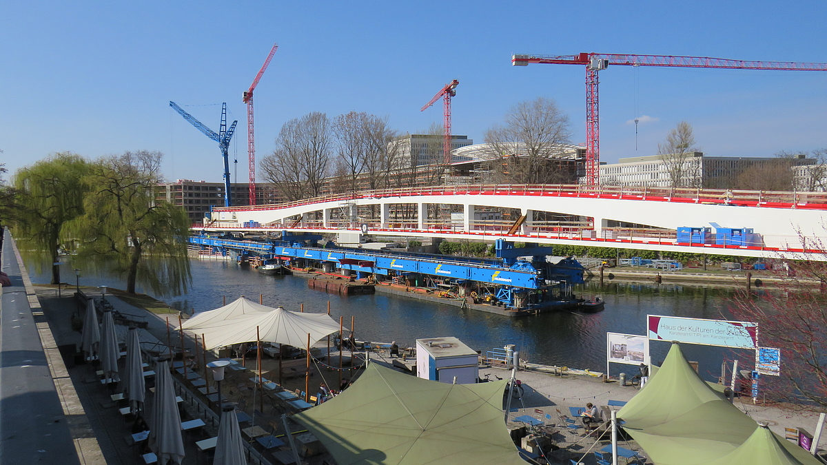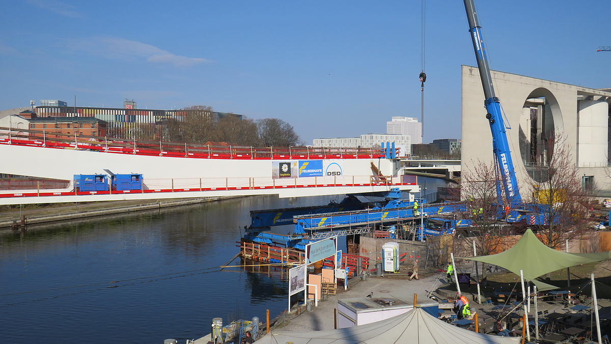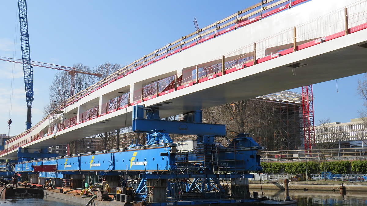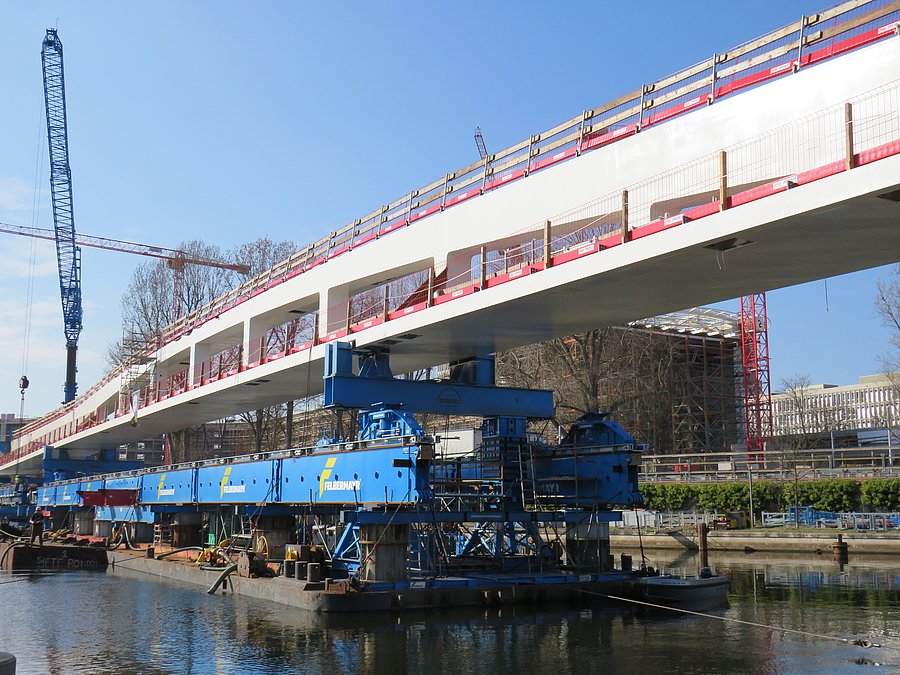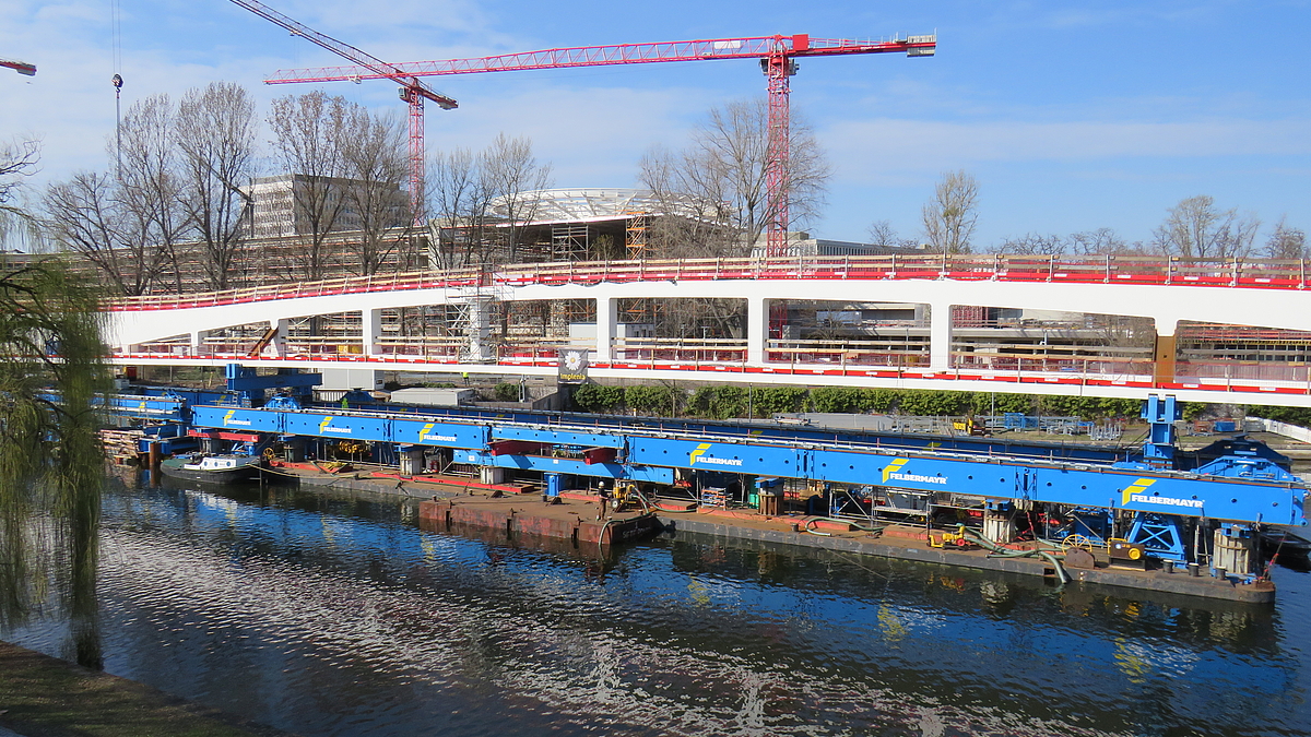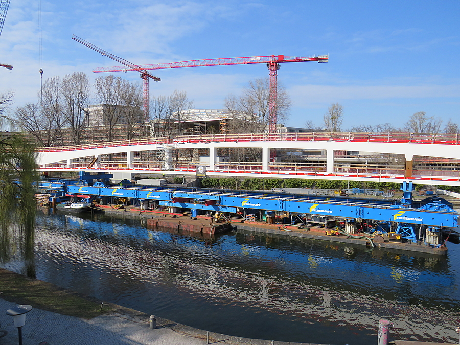 Die einzelnen Brückenschüsse wurden zunächst in westlicher Seitenlage vormontiert und anschließend mithilfe von SPMT sowie Verschubbahnen auf den Unterbauten sowie einem Ponton in die Endlage über die Spree verschoben. Nach dem Einschub wurden beim westlichen Widerlager eine Einspannung des Überbaus in die Unterbauten hergestellt und die endgültigen Zugpendel am östlichen Widerlager sowie die Lager über den Pfeilern eingebaut.