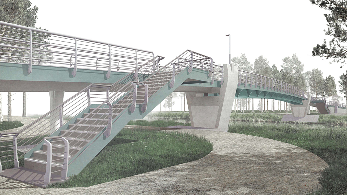 Der Überbau wird in Stahlbauweise mit einem Kastenquerschnitt (Konstruktionshöhe 0,80 bis 1,30 m) geplant. Der Einhub des Überbaus mittels Kranmontage vom Uferweg aus ist für Ende des Monats vorgesehen. Die Unterbauten werden in Stahlbeton ausgeführt. Die Brücke wird auf Ort-Stahlbetonbohrpfählen tief gegründet.