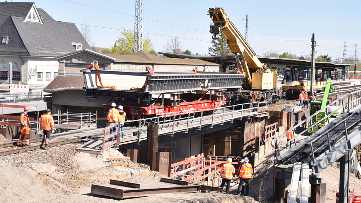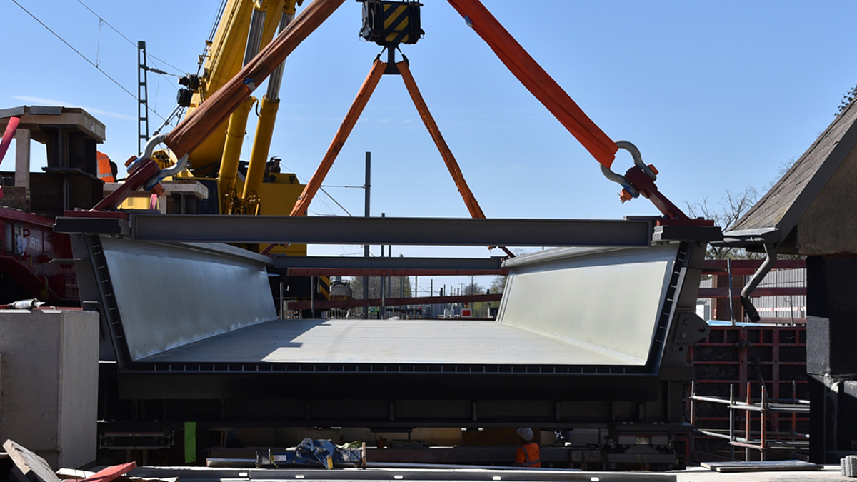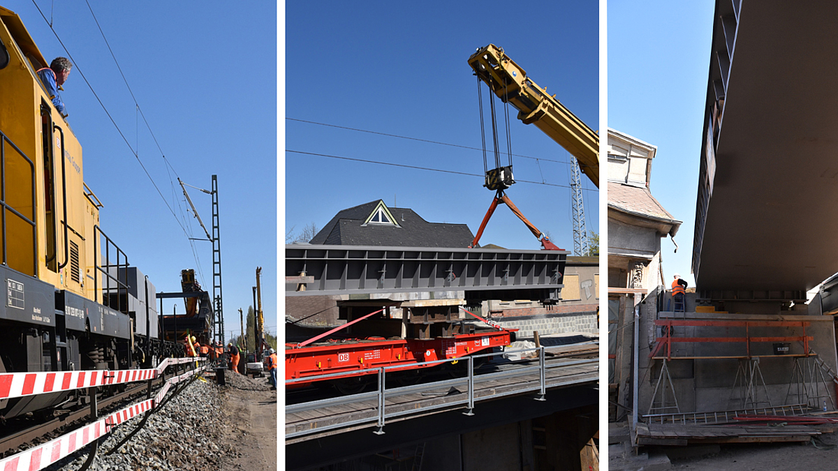 Hierfür wurde ein Waggon mit dem Brückenbauteil auf einer Hilfsbrücke positioniert und die Brücke mit Hilfe von zwei Eisenbahndrehkranen angehoben und seitlich verschwenkt in die Endlage auf die beiden neu errichteten Widerlager gebracht. „Es ist gut zu wissen, dass die Baustelle auch unter den jetzigen Umständen gut funktioniert und der Einhub termingerecht erfolgen konnte“, sagt Cornelia Otto, die als Projektingenieurin maßgeblich an der Bearbeitung des Projekts beteiligt ist.