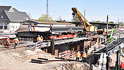 Der Ersatzneubau der Brückenbauwerke erfolgt unter laufendem Betrieb, temporär ist daher der Einsatz von Hilfsbrücken erforderlich. Der Einhub der Brücken erfolgt abschnittsweise während Sperrpausen. Am 18. April 2020 war es wieder so weit: Die zweite Brücke wurde eingehoben.