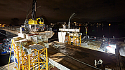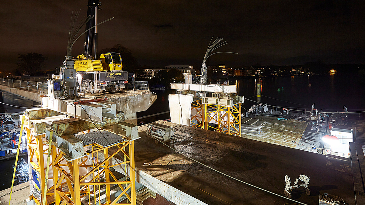 Hierfür wurde zunächst das ca. 600 to schwere südliche Stromfeld mit Hilfe von 2 Schnitten vom restlichen Überbau getrennt, mittels Litzenhebern auf zwei unter dem Überbau positionierten GSP54-Pontons abgesenkt und anschließend an die am Ufer liegende Arbeitsfläche verschoben. Der weitere Abbruch erfolgt konventionell mittels Bagger.