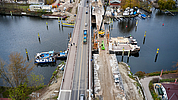 Die Bauarbeiten an der Salvador-Allende-Brücke in Berlin-Köpenick über die Müggelspree schreiten weiter voran. Im Rahmen des 2. Bauabschnitts wurde Anfang der Woche unter Vollsperrung der Wasserstraße mit dem Abbruch des östlichen Überbaus der 136 m langen Spannbetonbrücke begonnen.