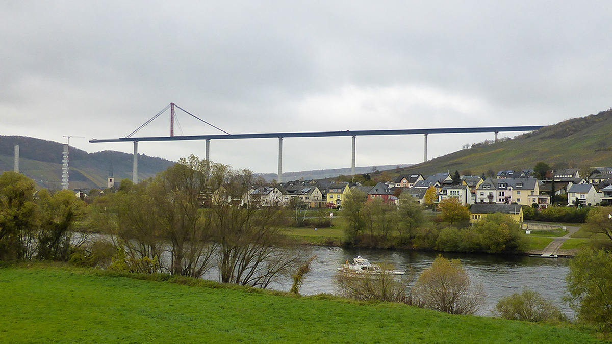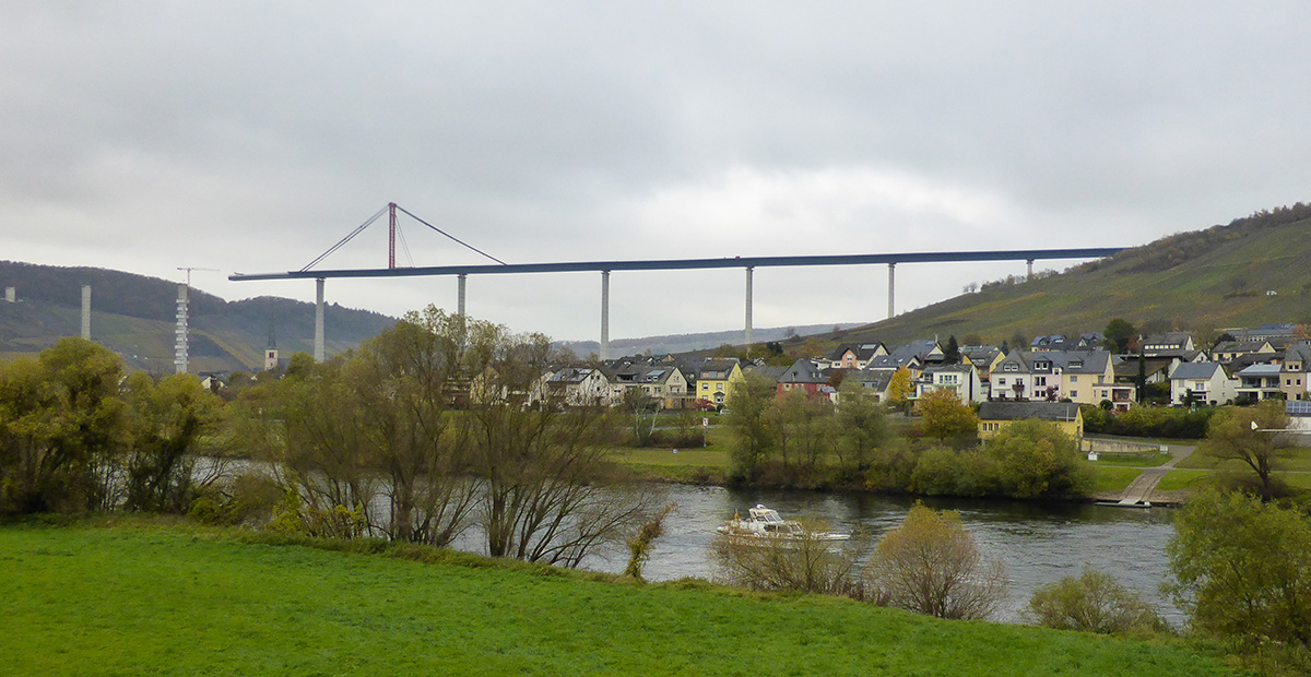 The bridge is the centerpiece of a 25-kilometer-long newly-constructed section of road between the A1 near Wittlich in the Eifel and the connector road to the old B 50 near Longkamp in the Hunsrück. The B 50 is part of the four-lane High Moselle Crossing, which in turn makes up part of the long-distance highway connection between Belgian and Dutch ports on the North Sea and the Rhein-Main region.