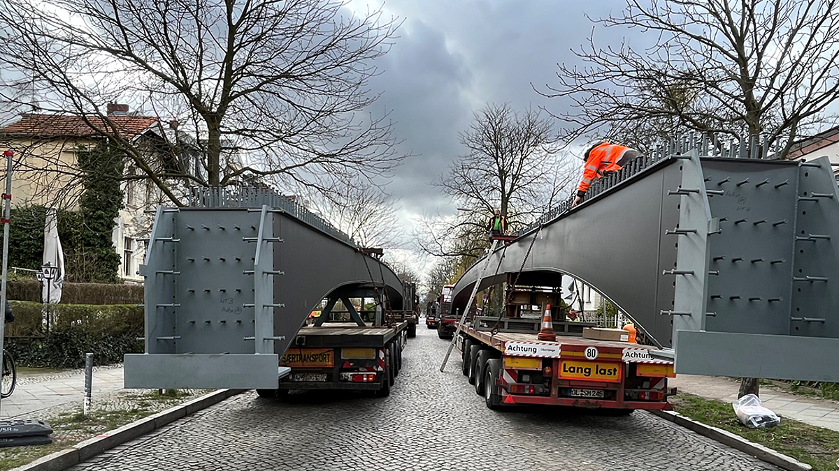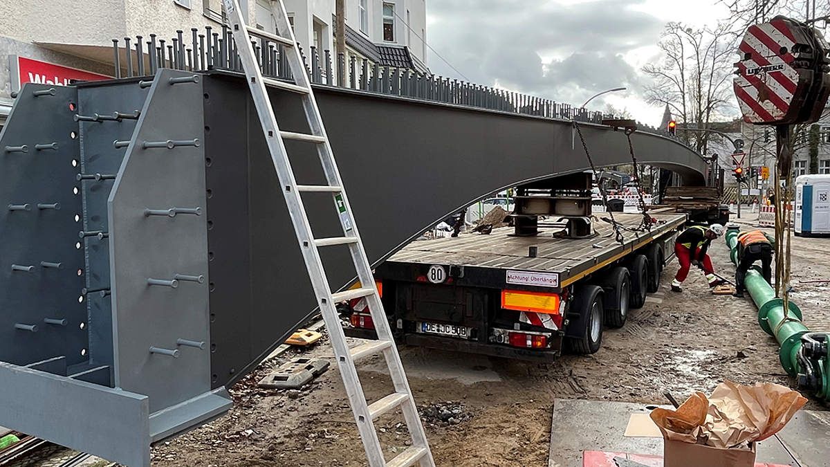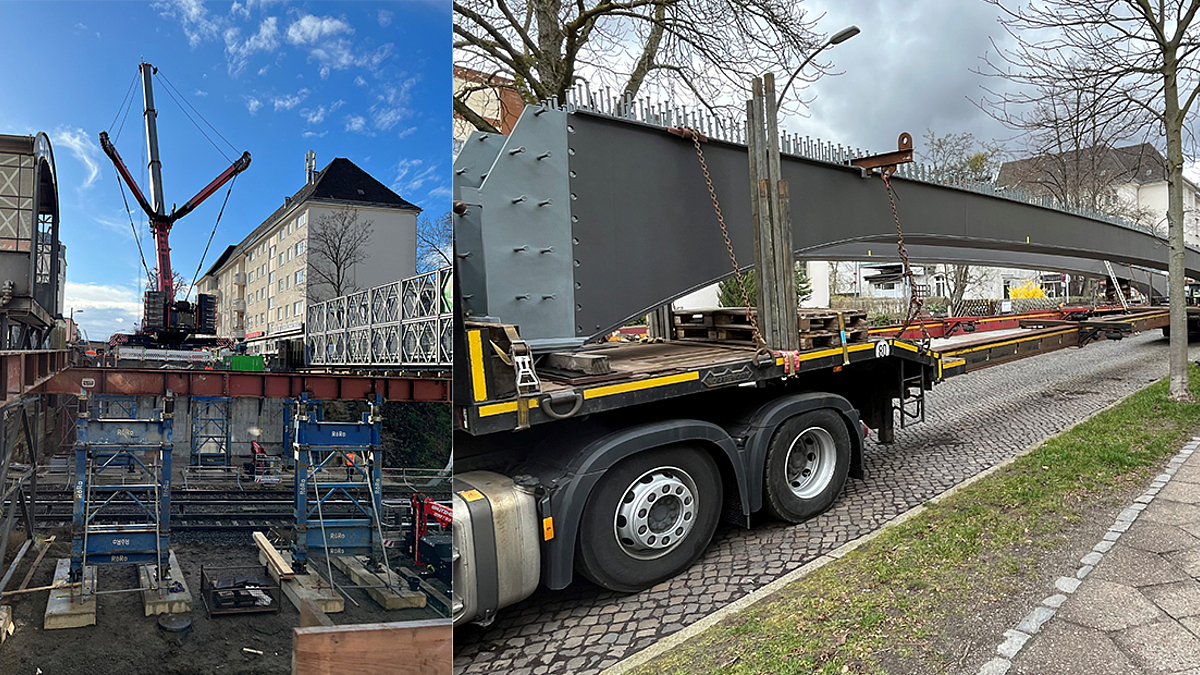 Dafür wurden zunächst mit einem Schwerlastkran fünf jeweils 35 Meter lange Brückenträger aus Stahl eingehoben. Im Anschluss wurden die vorgefertigten Halbfertigteilplatten, die später die Fahrbahnplatte bilden, auf die Längsträger aufgelegt. Im nächsten Schritt erfolgt im Mai die Betonage vom Überbau oberhalb der Fertigteile und dann der Rahmenecken.