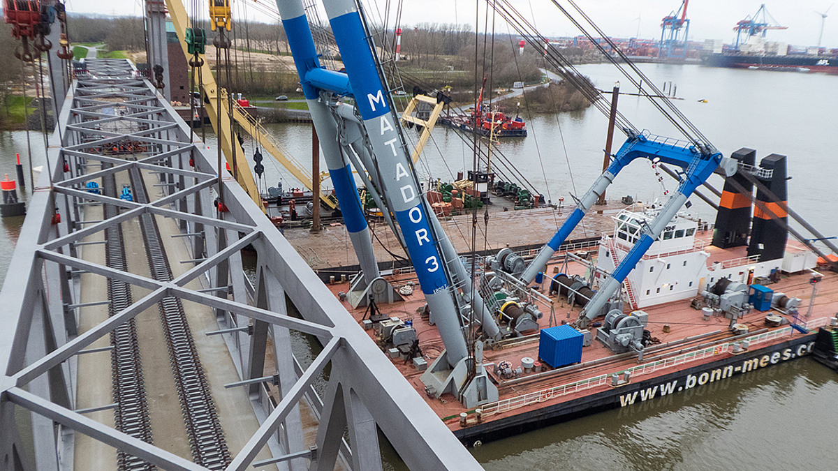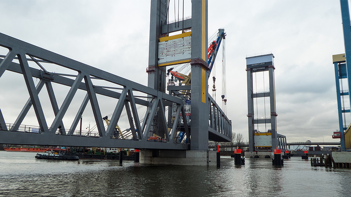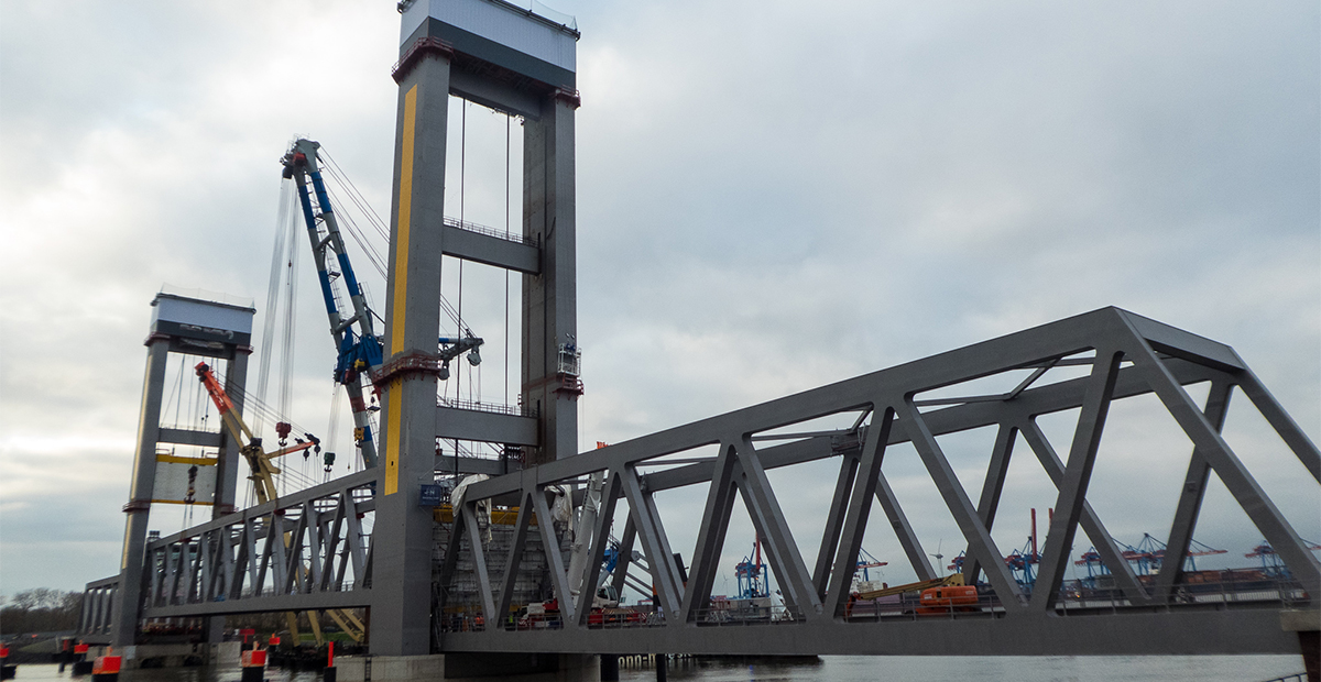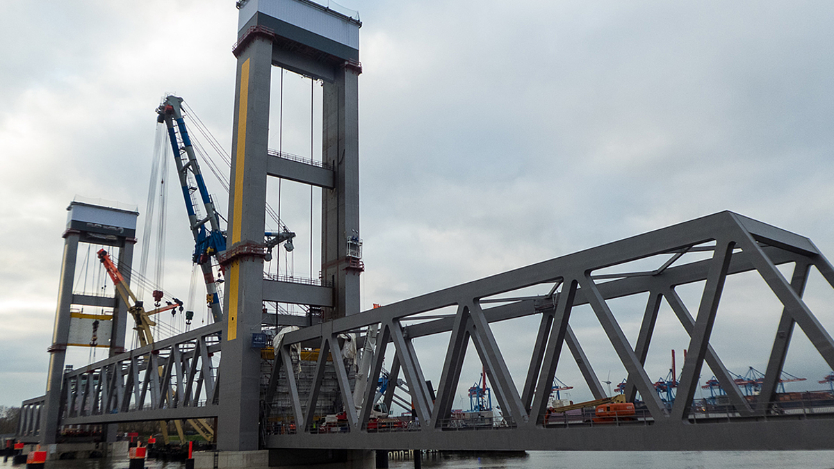 Neue Bahnbrücke Kattwyk – Das Hubfeld ist an seinem Platz