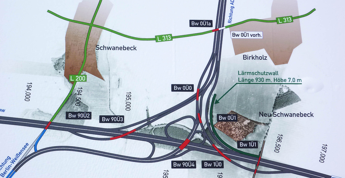 Das Bauvorhaben A 10/A 11 Berliner Ring, Um- und Ausbau des Autobahndreiecks Schwanebeck ist bis Ende 2013 ein Schwerpunktprojekt des LB Straßenwesen Brandenburg. Am 5. Mai 2011 wurde der 1. Spatenstich gesetzt. Im Zuge der zukünftigen direkten Verbindung der A 10 Nord zur A 11 und der A 11 zur A 10 Ost werden mehrere Überflieger realisiert - der längste ist mit über 170 m das Brückenbauwerk 1Ü0 in Richtung AD Spreeau.