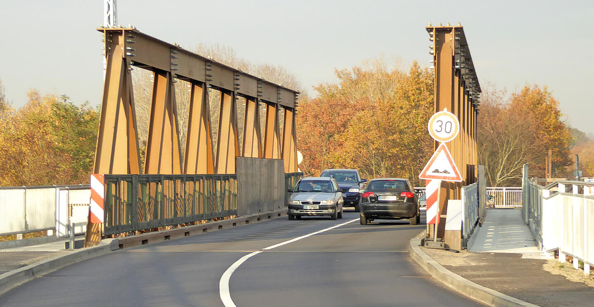 Der Überbau der Behelfsbrücke wird durch ein Straßenbrückengerät vom Typ SS 80 realisiert. Dieses schwere Brückengerät ist eine stählerne zweispurige Fachwerkbrücke mit beidseitig angeordnetem Gehweg. Der Überbau kann in Stützweiten bis 80 m ausgeführt werden, hier beträgt die Stützweite 49 m.