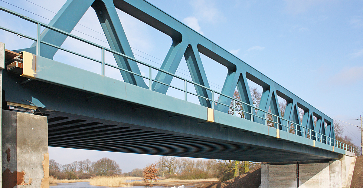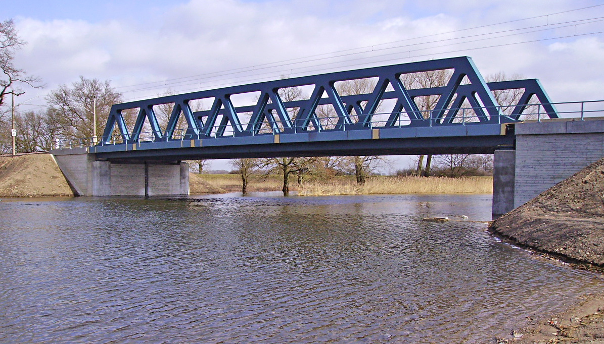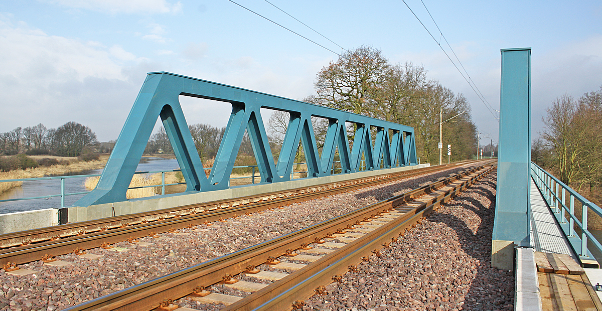Ersatzneubau einer Eisenbahnbrücke über den Aland. Der Überbau ist eine gerade Stahlfachwerkbrücke mit einer Stützweite von 42,00 m und einer Systemhöhe des Fachwerks von 4,20 m. Die beiden Fachwerkscheiben sind in einer Systembreite von 9,90 m angeordnet, zwischen denen sich eine stählerne Fahrbahnplatte spannt, die aus einem 25-35 mm dicken Fahrbahnblech und im Abstand von 70 cm angeordneten Querträgern besteht.