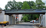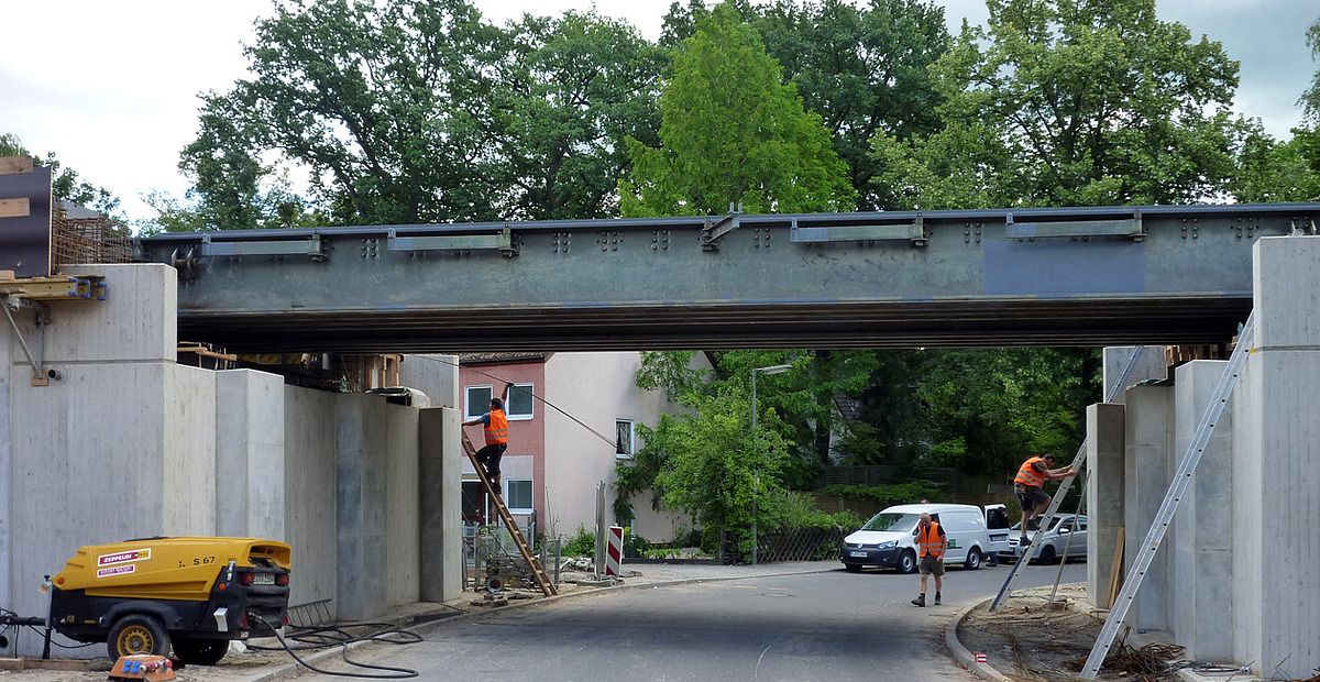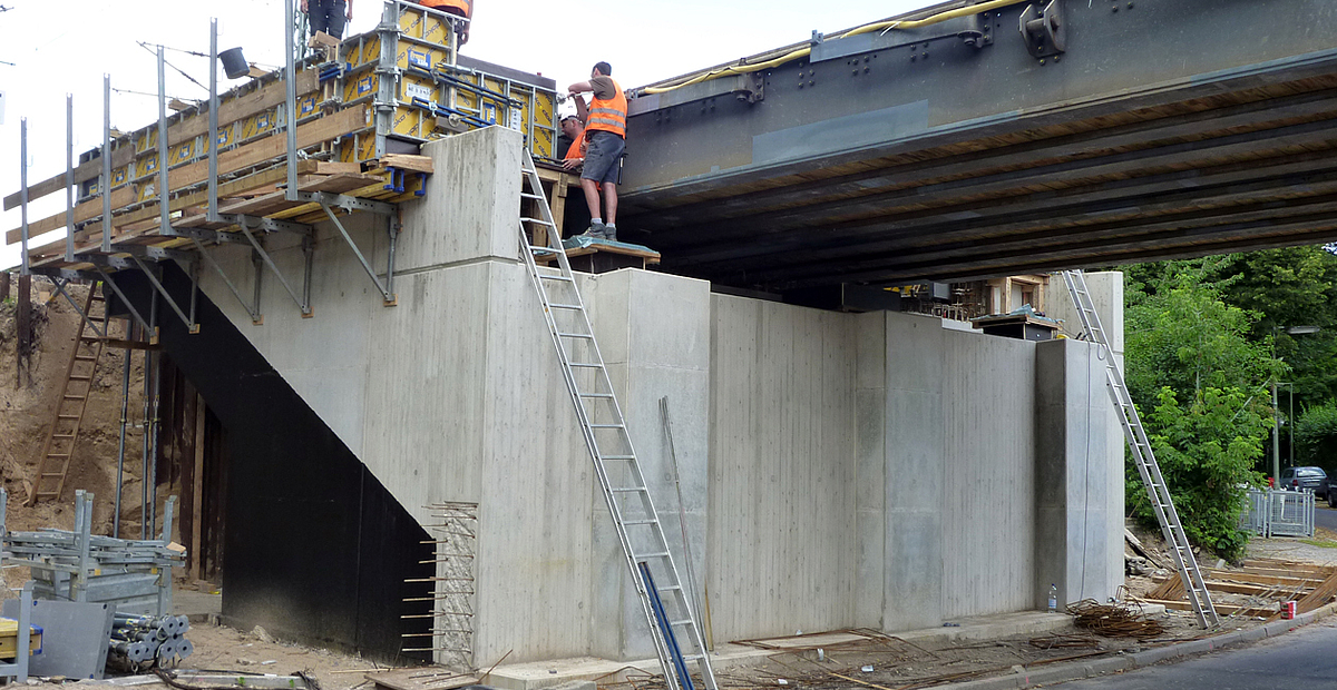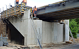 Während der Bauzeit wurde die alte Brücke durch eine 28,0 m lange Hilfsbrücke ersetzt. Für die Widerlager wurde der Baugrund mittels HDI-Verfahren gefestigt. Daraufhin konnten die neuen kastenförmigen Widerlager an gleicher Stelle wie die ursprünglichen Widerlager errichtet werden. Anschließend wurde der vorgefertigte Stahlüberbau eingehoben.