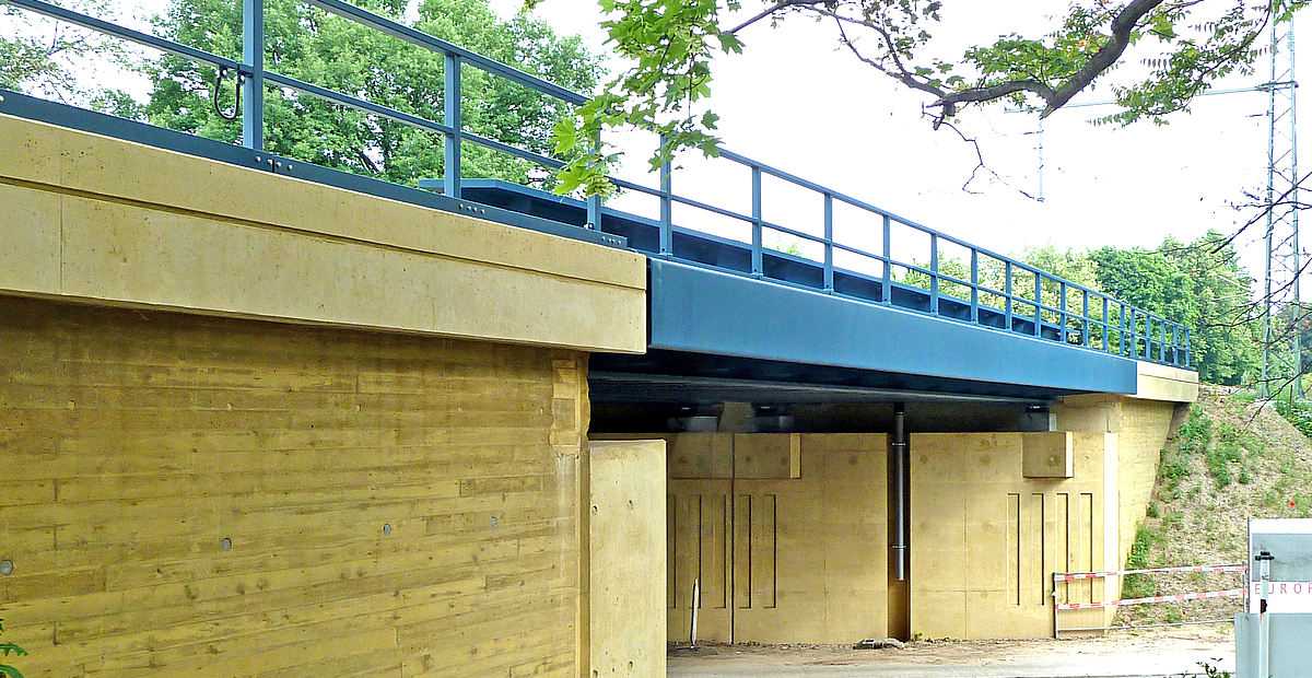 Die Überbauten wurden vorgefertigt auf die Baustelle transportiert und innerhalb einer Sperrpause mit Kränen eingehoben. Die Gehwegkonsolen wurden am Kran hängend mit Schraubenverbindungen befestigt.