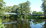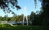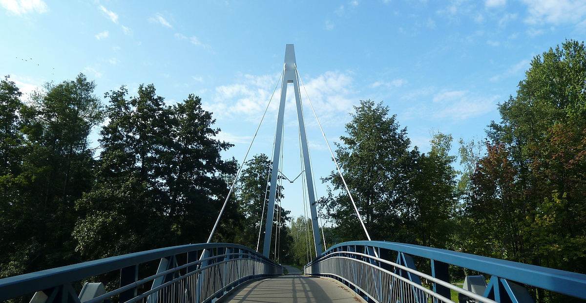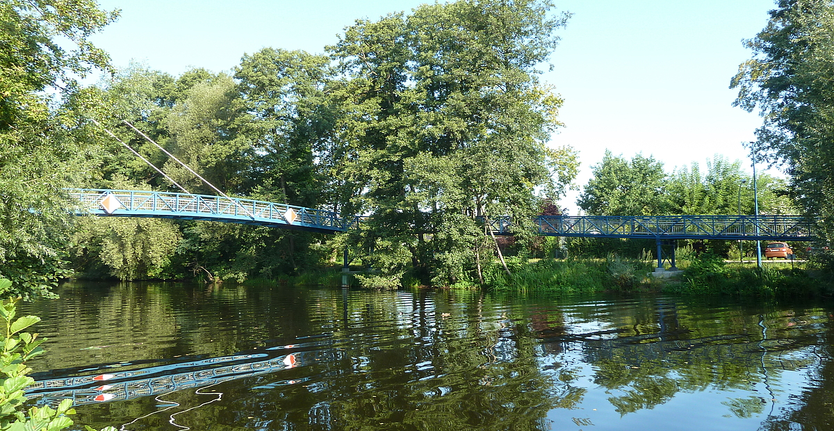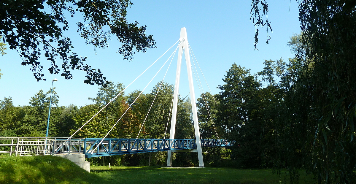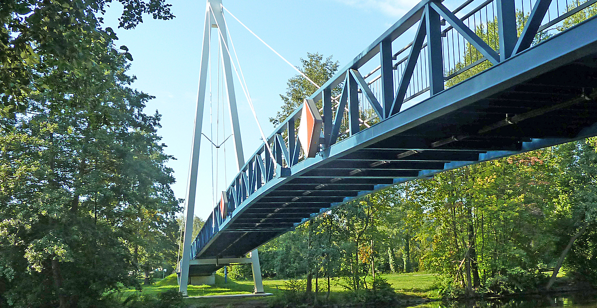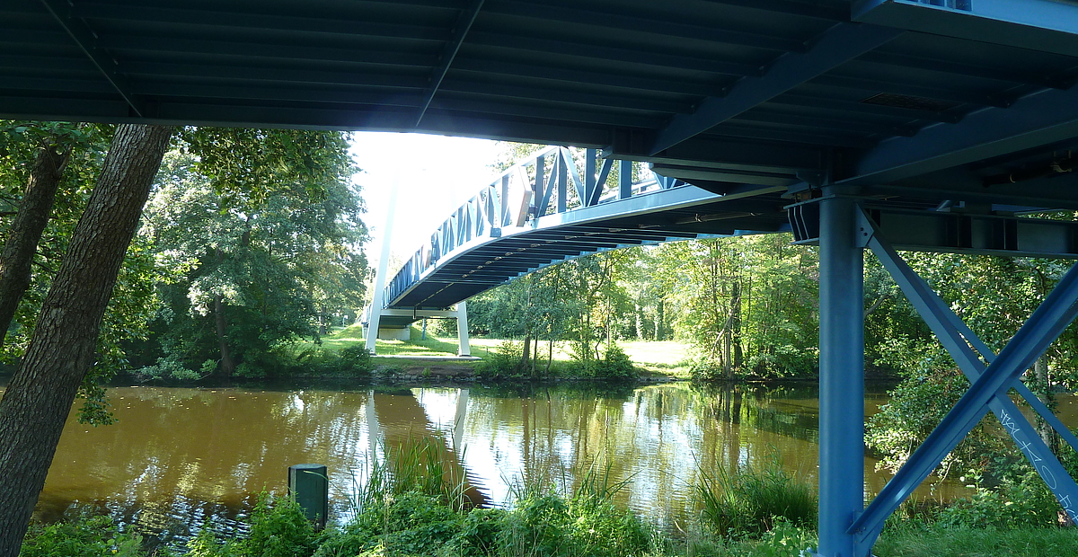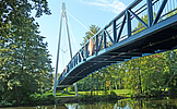 Brückenneubau im Zuge des Radfernweges Berlin-Koppenhagen über den Aalemannkanal in Berlin-Spandau. Aufgrund des flachen Geländes und des einzuhaltenden Lichtraumes (b = 14,00 m, h = 4,50 m) ergeben sich erhebliche Höhendifferenzen, die mit Hilfe von Rampen und einem Überbauquerschnitt als Trog mit sehr geringer Bauhöhe minimiert wurden.