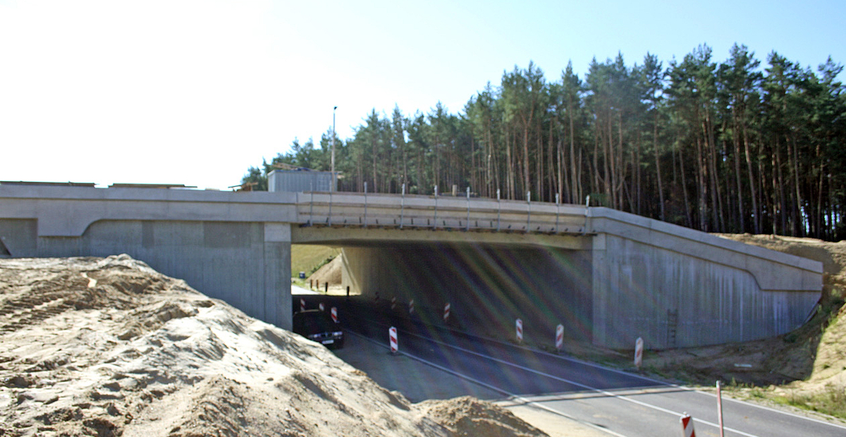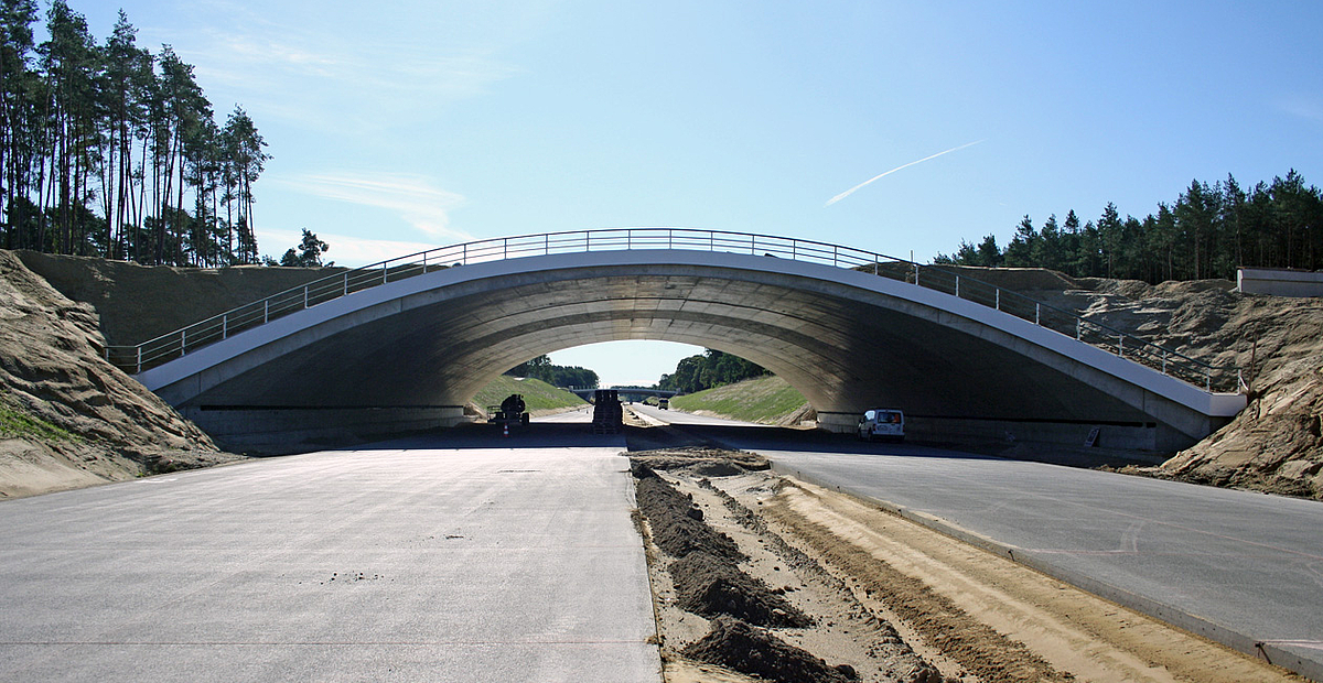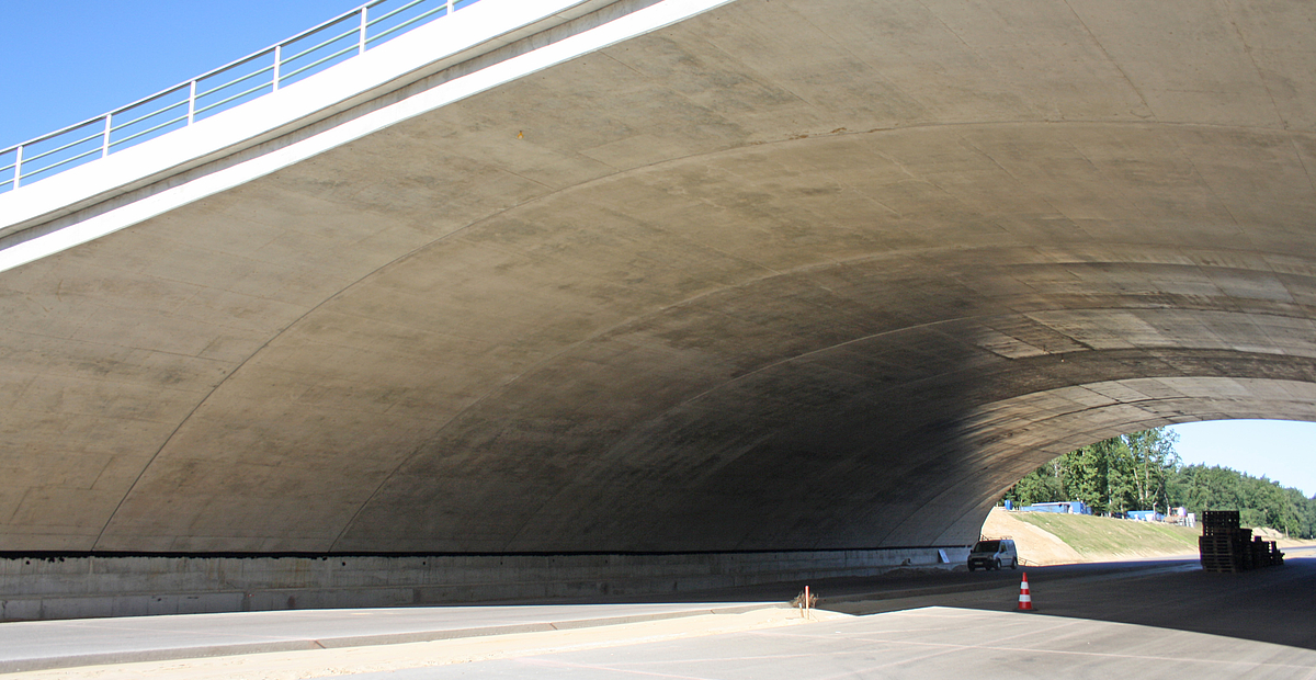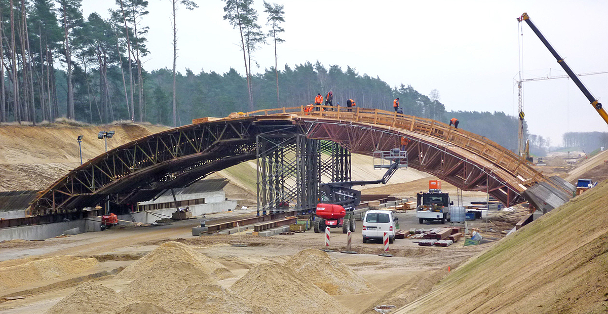 Neubau einer Grünbrücke über die A14 als überschüttetes Bogentragwerk in Ortbetonbauweise. Die Gründung erfolgt mittels Streifenfundamenten auf den anstehenden, tragfähigen Sanden.