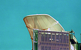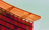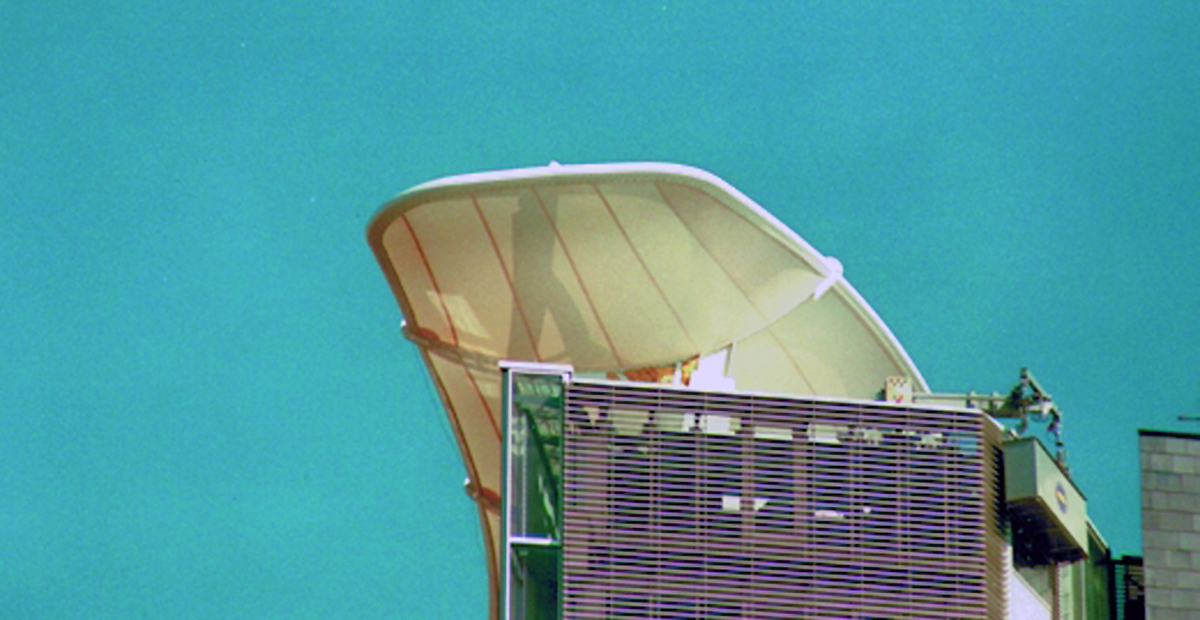 Nach Herstellung des GSW-Gebäudes kragten 9 Stahlstützen aus der Technikzentrale des Gebäudes aus. Auf ihnen wurden die Fachwerkträger montiert und danach das Membrangewebe unter die Träger gespannt.