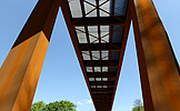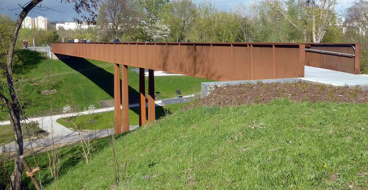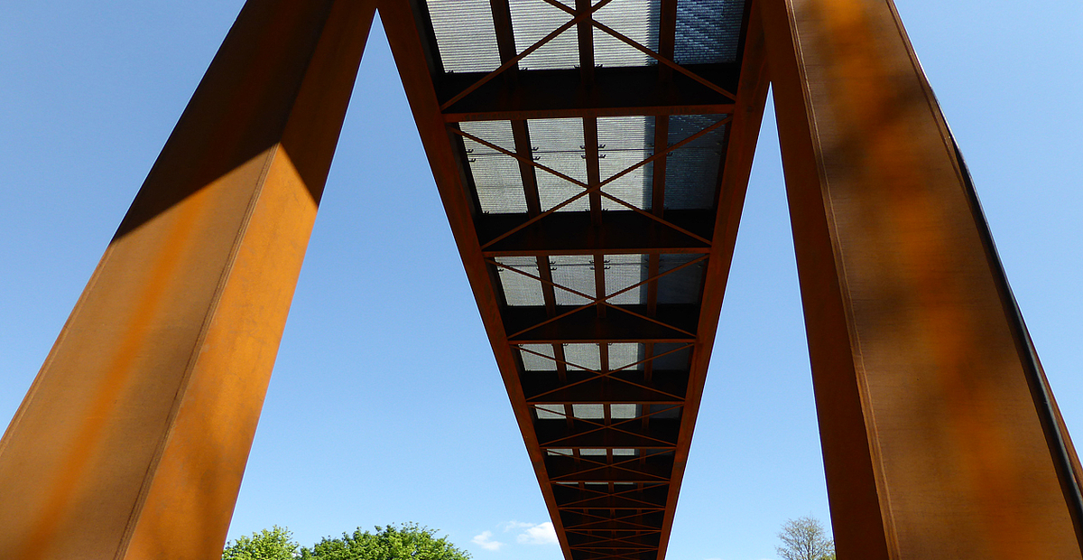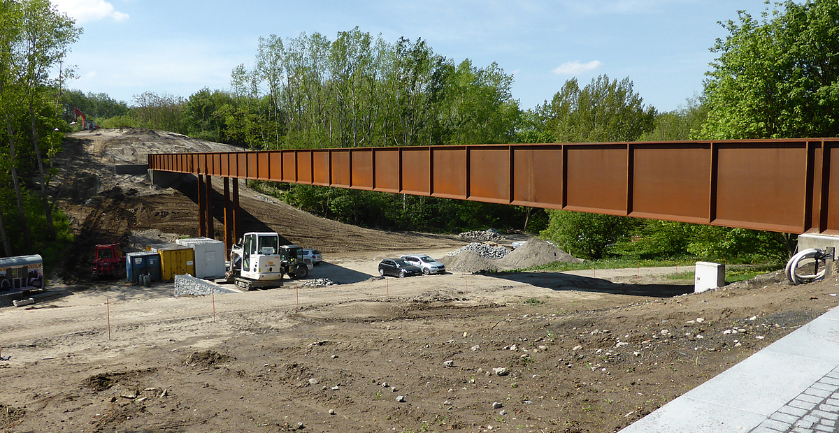 Der Überbau wird in sechs Abschnitten auf Hilfsstützen mit Hilfe eines Krans montiert und anschließend zusammengeschweißt. Er besteht aus zwei Haupt- und drei Längsträgern, die im Abstand von 2,40 m durch Querträger verbunden werden. Der Überbau und die Stützen werden aus wetterfestem Baustahl gefertigt. Die Gehbahn der Brücke wird als Gitterrost-Konstruktion ausgebildet.