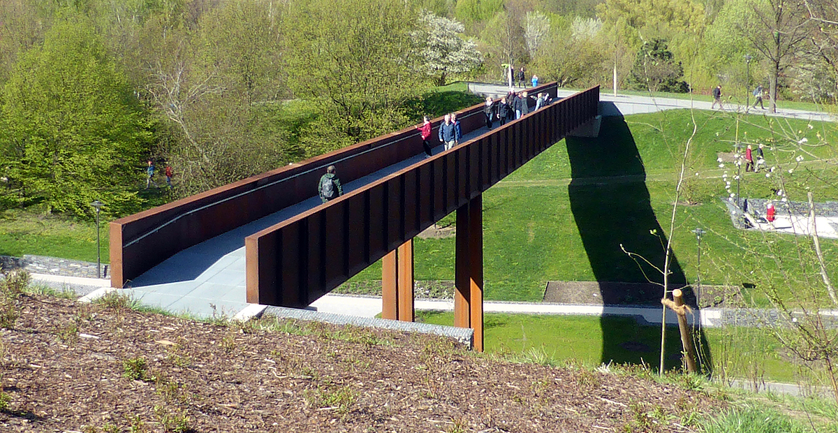 Die Tälchenbrücke bildet das Bindeglied zwischen den bestehenden Gärten der Welt und dem Kienbergplateau. Neben den Widerlagern auf dem Kienberg und Marzahner Ausguck soll die Brücke eine Mittelstütze im Bereich der Grenze Parkgelände/Kienberg erhalten.