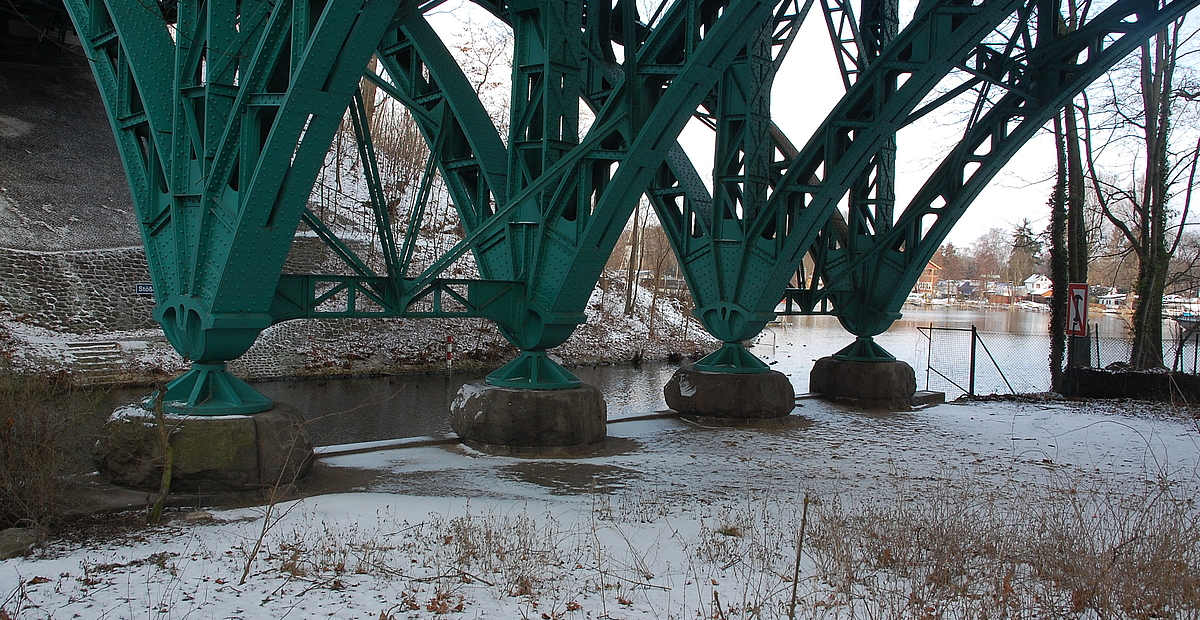 Bei der über 100 Jahre alten genieteten Stahl-Fachwerkbrücke über den Stößensee wurden die beweglichen Lager am westlichen und östlichen Widerlager instandgesetzt. Dazu sind die vorhandenen Rollenlager aus Stahlguss durch in Abmessung, Form und Materialwahl baugleiche Lager ausgetauscht worden.