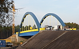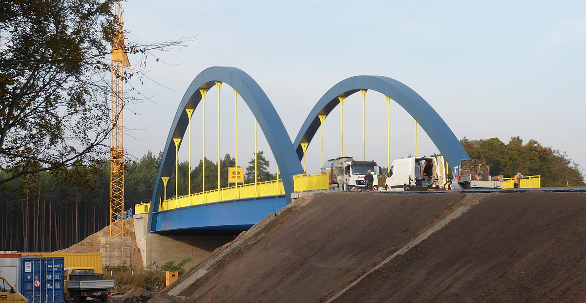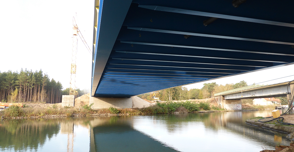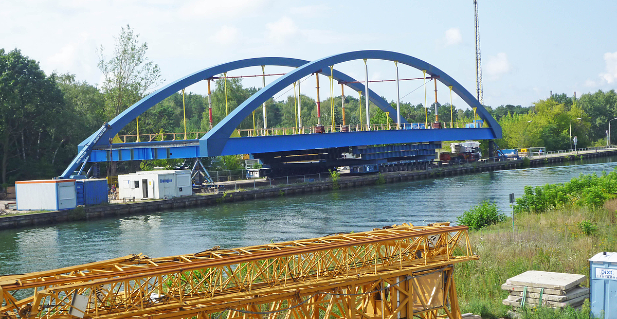 Die stählerne Stabbogenbrücke hat eine Stützweite von 80,10 m und eine Nutzbreite von 13,25 m. Die Versteifungsträger sind über vertikale Hänger an die Bögen angeschlossen. Die Querträger in Doppel-T-Form sind mittels Kopfbolzendübeln mit der Ortbetonplatte verbunden. Aufgrund des Kreuzungswinkels zwischen Straßen- und Kanalachse von 75,6 gon werden die Widerlager schiefwinklig zum Überbau hergestellt.