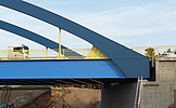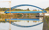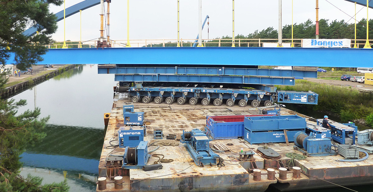 Der Stahlüberbau wurde im Werk vorgefertigt, in einzelnen Montageschüssen zur Baustelle transportiert, dort montiert und in einem Stück mittels Ponton eingeschwommen.