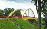 Die Stützweite beträgt 63,50 m, dieBreite zwischen den Geländern ist 8,00 m. Die Bögen sind geschweißte Hohlkästen mit variabler Querschnittshöhe (0,67 m bis 1,40 m) und haben eine Breite von 0,80 m, die Versteifungsträger haben eine Bauhöhe von 1,65 m und werden über vertikale Hänger im doppelten Querträgerabstand von 6,35 m an die Bögen angeschlossen. Die Konstruktionshöhe des Überbaus beträgt in Brückenachse 1,28 m einschließlich der 32 cm dicken Fahrbahnplatte und des Belags.
