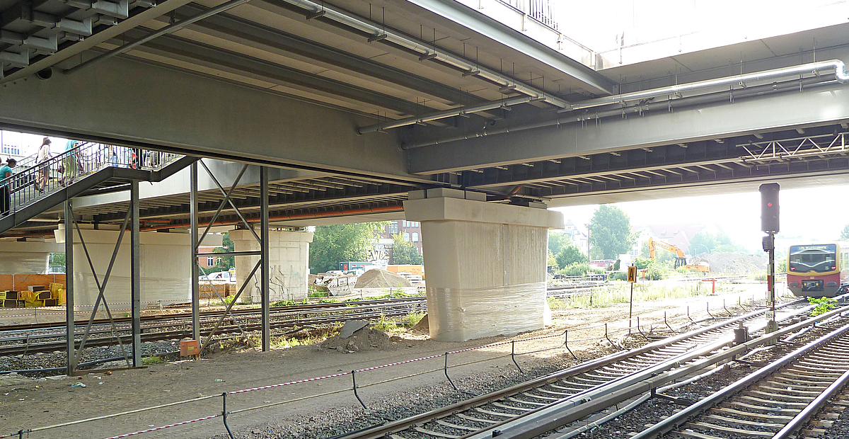 Die Kastenwiderlager mit angehängten Parallelflügeln sind flach, die Stahlbetonpfeiler auf Bohrpfählen tief gegründet. Nördlich und südlich der SÜ schließen sich Rampen an, die mit der neuen Trassenführung wieder an den Bestand angebunden werden. Die Rampen werden aus Stahlbetonwin-
