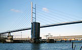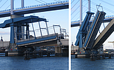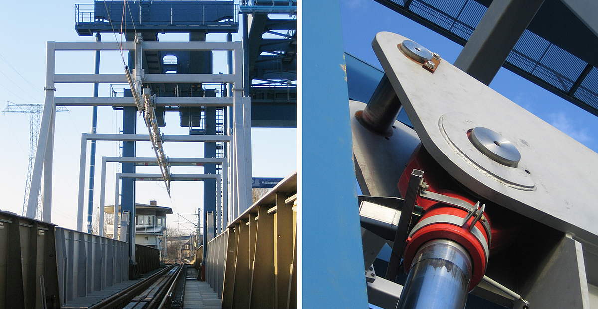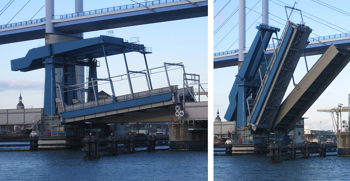Die Brücke wird über Feintariergewichte auf eine Mindestspitzenlast eingestellt und erhält eine Spitzenverriegelung sowie Spitzenzentrierung. Das Klappen der Brücke erfolgt über zwei Hohlzylinder die am Pylonfuß gelagert sind und an den Klappenteilen angreifen. Das Klappen erfolgt bis in nahezu senkrechte Lage.